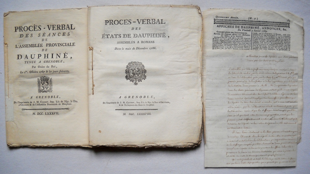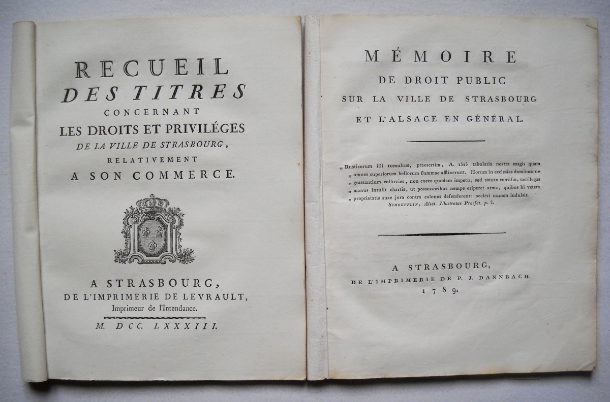 27 novembre 1786. A Paris, chez P.G. Simon & N.H. Nyon, 1786, 16 pp., in-4 - Arrêt du conseil d'tat du roi portant règlement pour la marque & visite des toiles blanches & imprimées des manufactures d'Alsace, 26 janvier 1786. A Paris, de l'imprimerie royale, 1786, 10 pp., in-4 - Procès-verbal des séances de l'assemblée provinciale de Dauphiné, tenue à Grenoble, par ordre du roi, le 1er octobre 1787 & les jours suivants. A Grenoble, J.M. Cuchet, 1787, 63 pp., in-4 - Procès-verbal des états de Dauphiné, assemblés à Romans, dans le mois de décembre 1788. A Grenoble, J.M. Cuchet, 1788, 195 pp. et table des matières, in-4 - Arrêt du conseil d'état du roi qui casse une ordonnance du lieutenant général du bailliage de Vesoul en ce qui concerne les ordres du clergé & de la noblesse, 15 avril 1789. A Paris, de l'imprimerie royale, 1789, 4 pp., in-4 - Mandat pour les députés aux états généraux donné par les états du Dauphiné. 3 pp. manuscrites, in-8 - Affiches de Dauphiné, annonces, &c, du vendredi 9 janvier 1789. N°37, Ve Giroud & fils, 4 pp., in-4 - Mémoire de droit public sur la ville de Strasbourg et l'Alsace en général. A Strasbourg, P.J. Dannbach, 1789, 135-10 pp., in-4 - etc.