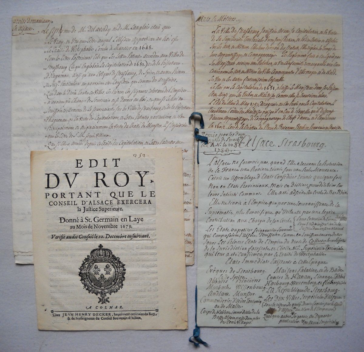 13 septembre 1670. A Paris, par Sébastien Mabre-Cramoisy, 1670, 4 pp., in-8 - Edit du roy portant que le conseil d'Alsace exercera la justice supérieure. A Colmar, chez Jean Henry Decker, 1679, 4 pp., in-8 - Arrest contradictoire du conseil d'estat du roy qui maintient les habitans de la ville d'Auxonne en la jouissance de leurs privilèges et exemptions