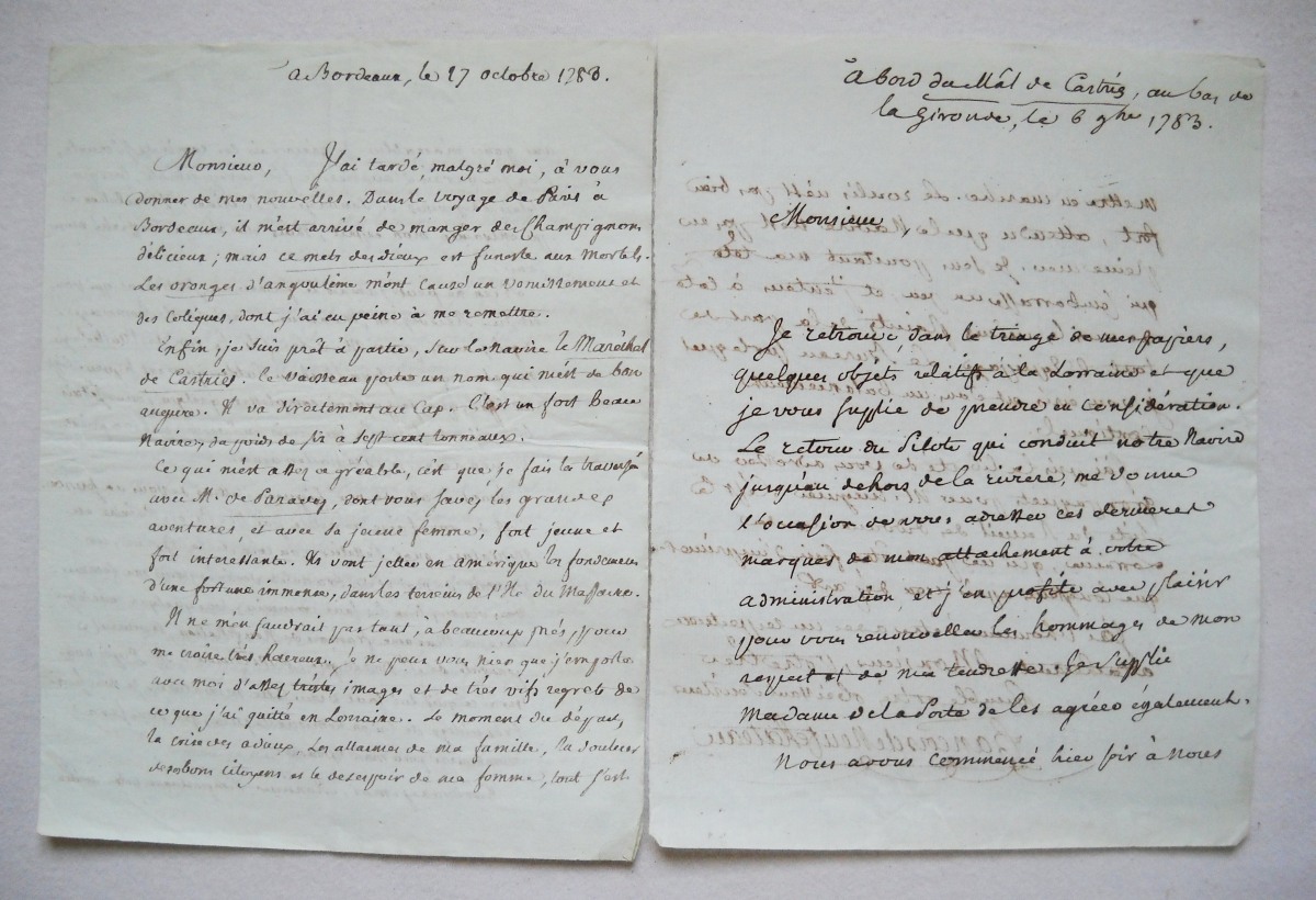 Bel et rare ensemble de lettres suivies et échangées entre un jeune poète débutant sa carrière dans l'administration royale et M. de La Porte, son protecteur et bienfaiteur. Il y relate ses fonctions et ses vélléités de promotion sociale (lieutenant général civil et criminel au bailliage et siège présidial de Mirecourt, puis subdélégué à l'intendant), son projet de mariage et ses péripéties lors de son séjour à Saint Domingue de 1783 à 1787 et notamment son naufrage.