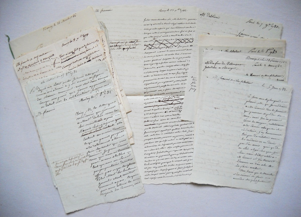 85 L.A.S., 2 L.S. et 13 pièces diverses (dont L.S. du marquis de Castries ministre de la Marine du 23 novembre 1782) de Nicolas François de Neufchâteau adressées à Jean-Baptiste-François de La Porte de Meslay, intendant de Lorraine et du Barrois, 1778-1787 ; 3 L.A.S. de Nicolas François de Neufchâteau adressées à Anne-Marie Meulan-Desfontaines, épouse dudit de La Porte.