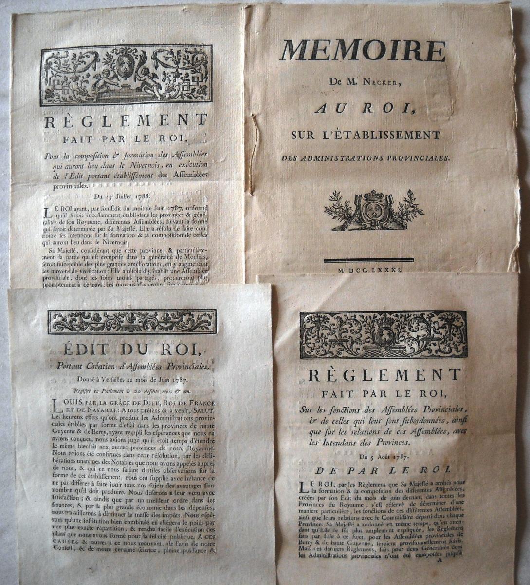Mémoire donné au par M. Necker en 1778. Copie manuscrite de 15 ff., in-fol. - Mémoire de M. Necker, au roi, sur l'établissement des administrations provinciales. 1781, 32 pp. - Discours prononcé de l'ordre du roi et en sa présence par M. de Calonne, contrôleur général des finances, dans l'assemblée des notables, tenue à Versailles, le 22 février 1787. A Versailles, Ph.-D. Pierres, 1787, 34 pp., in-4 - Règlement fait par le roi sur la formation & la composition des assemblées qui auront lieu dans la généralité d'Amiens, 8 juillet 1787. A Paris, de l'imprimerie royale, 1787, 12 pp., in-4 - Règlement fait par le roi, sur les fonctions des assemblées provinciales, et de celles qui leur sont subordonnées, ainsi que sur les relations de ces assemblées, avec les intendants des provinces, du 5 août 1787. A Paris, de l'imprimerie royale, 1787, 19 pp. - Arrêt de parlement de Bordeaux faisant inhibitions et défenses à totues personnes de quelque ordre que ce soit de se réunir en corps d'assemblées provinciales, avant que l'édit portant création de ces assemblées soit enregistré en la cour, 8 août 1787. 2 pp., in-8 - Edit du roi, portant création d'assemblées provinciales, donné à Versailles au mois de juin 1787. A Paris, de l'imprimerie royale, 1787, 4 pp. - Déclaration du roi, portant la conversion de la corvée en une prestation en argent, donnée à Versailles le 27 juin 1787. A Nancy, chez la veuve Charlot, 6 pp. - Réponse aux remontrances du parlement de Bordeaux, 29 octobre 1787. 7 pp., in-4 - Arrêt du conseil d'état du roi, portant règlement pour les assemblées provinciales, de département et municipales, sur les formes de la répartition et assiette de la taille, capitation et autres impositions… A Paris, de l'imprimerie royale, 1788, 11 pp. - 34 pièces, dont règlements du roi portant établissement d'une administration provinciale dans les généralités de Moulins, Amiens, Rouen, Caen, Alençon, Orléans, Tours, Lyon, Auch ; et les provinces du Bourbonnais, Nivernais, Champagne, les Trois-Evêchés, Isle de France, Soissonnais, Alsace, Hainaut, Auvergne, Limousin, Poitou, Dauphiné, Roussillon, Etats de Franche-Comté et de Flandre, duché de Lorraine et Bar - etc.