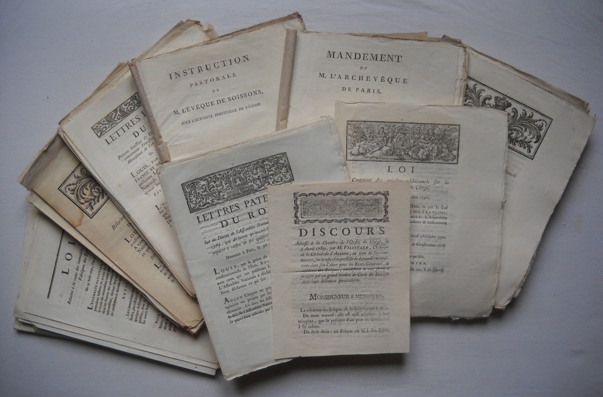 Lettres patentes du roi concernant la dixme, 23 juin 1790. A Paris, de l'imprimerie royale, 1790, 4 pp., in-4 - Proclamation du roi pour la constitution civile du clergé & la fixation de son traitement, 24 août 1790. A Paris, de l'imprimerie royale, 1790, 54 pp., in-4 - Loi concernant les religieux, les religieuses & les chanoinesses séculières & régulières, 14 octobre 1790. A Paris, de l'imprimerie royale, 1790, 24 pp., in-4 - Mandement de l'archevêque de Paris. A Paris, Crapart, 1790, 51 pp., in-4 - Instruction pastorale de M. l'évêque de Soissons, sous l'autorité spirituelle de l'église. A Paris, Crapart, 1791, 36 pp., in-4 - Loi relative au serment à prêter par les ecclésiastiques fonctionnaires publics, 18 mars 1791. A Blois, P.P.J. Masson, 1790, 3 pp., in-8 - Pétitions à l'assemblée nationale et au roi, 11 décembre 1791. 13 pp., in-4 - Copie de la lettre adressée aux tribunaux par le ministre de la justice à l'aoccasion des troubles religieux, 30 avril 1792. A Paris, de l'imprimerie royale, 1792, 8 pp., in-4 - Loi relative à la suppression des congrégations séculières & des confrairies, 18 août 1792. A Paris, de l'imprimerie nationale du Louvre, 1792, 27 pp., in-4 - Aux pasteurs des villes et des campagnes, 1er novembre 1792. A Paris, de l'imprimerie nationale exécutive du Louvre, 1792, 3 pp., in-4 - Décret de la convention nationale relatif à la liberté des cultes, 18 frimaire an second. A Paris, de l'imprimerie nationale exécutive du Louvre, an IIe, 3 pp., in-4 - etc.