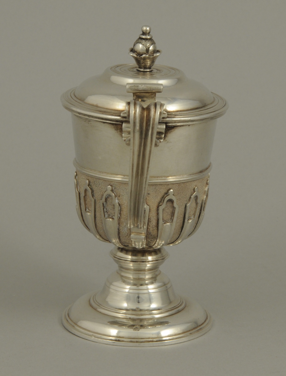 AVIGNON. MOUTARDIER couvert de forme balustre en argent orné à mi-corps d'appliques de lambrequins sur fond amati. Une prise en forme de graine (de moutarde ?) éclatée surmonte le couvercle à doucine. Il repose sur un piedouche mouluré et une base ronde unie, gravée de filets.