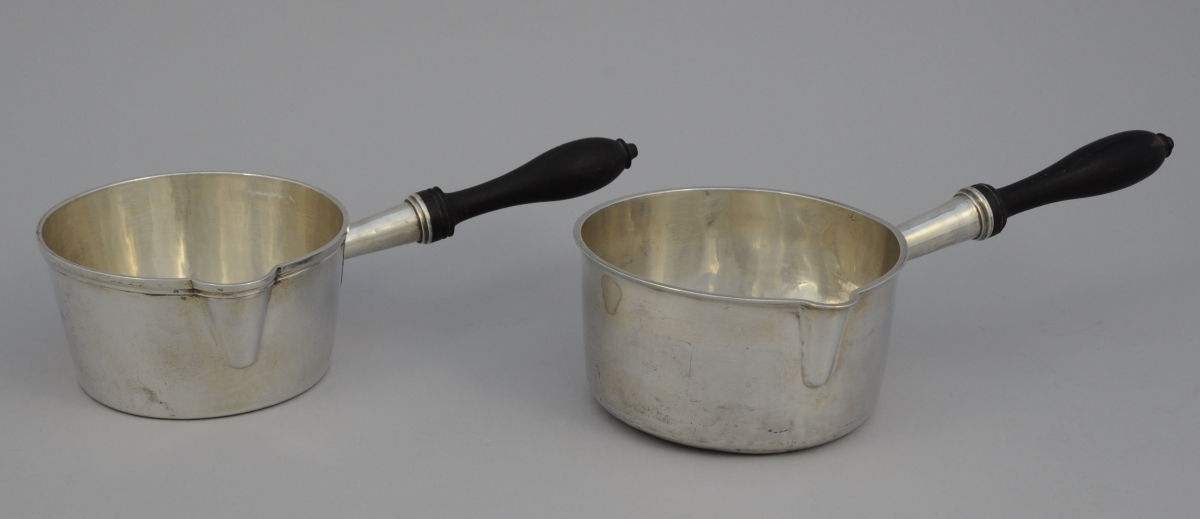 2 POÊLONS DE TABLE de forme circulaire en argent uni. Manche latéral en ébène tourné.