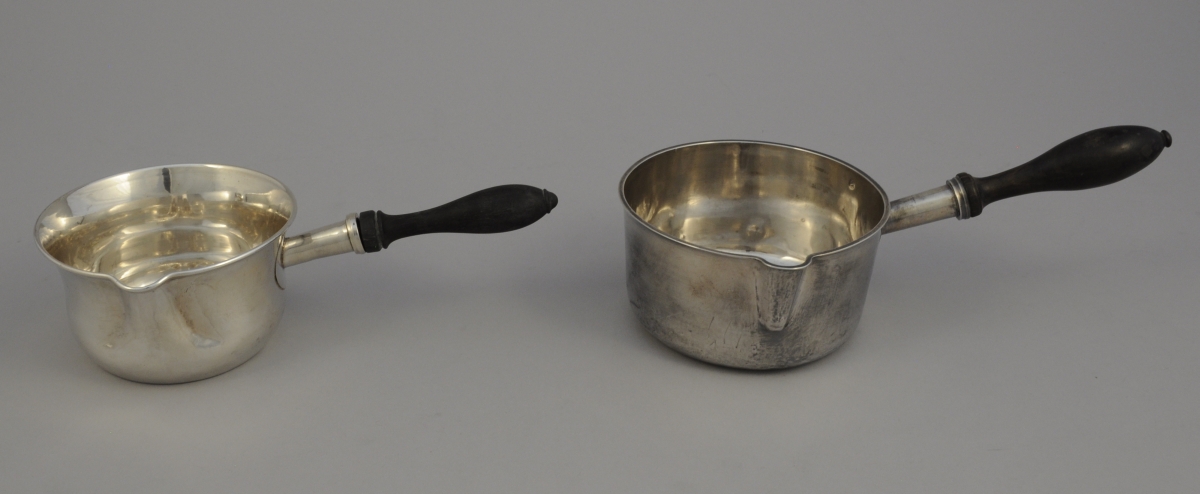 2 POÊLONS DE TABLE de forme circulaire en argent uni. Manche latéral en ébène tourné.