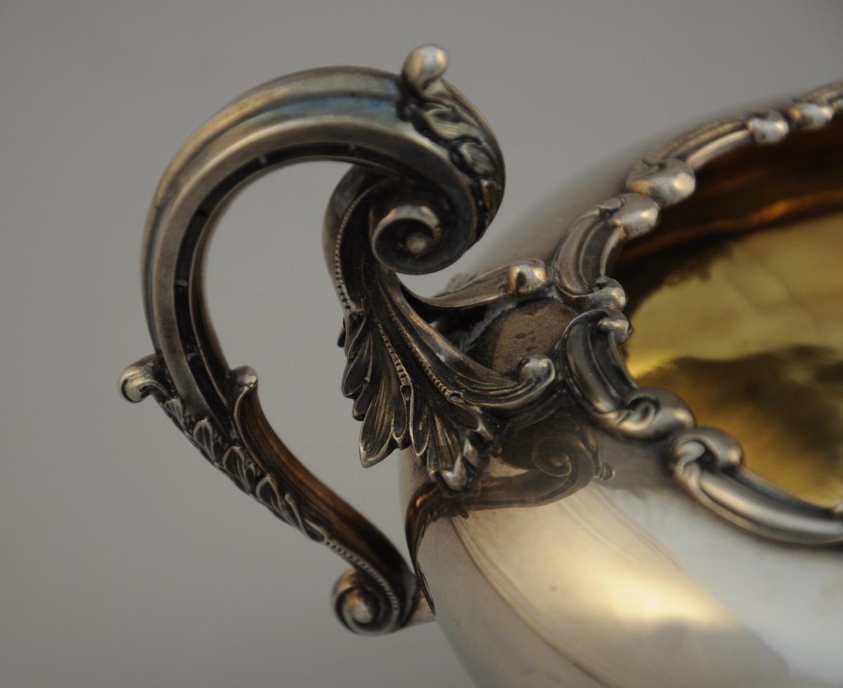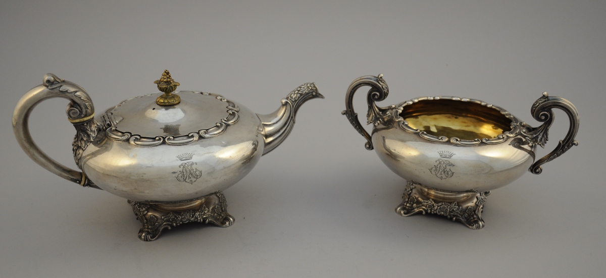 ODIOT. PARTIE DE SERVICE À THÉ, 2 pièces en argent. Composé d'une théière et d'un sucrier. Décor de frises d'agrafes feuillagées en partie supérieure. Les anses en volute agrémentée de feuilles d'acanthe stylisées, celle de la théière baguée d'ivoire. Reposent sur une base quadripode ornée de guirlande de fleurs. Monogramme "NC" timbré d'une couronne comtale. Le bec verseur de la théière godronné, l'intérieur du sucrier vermeillé.