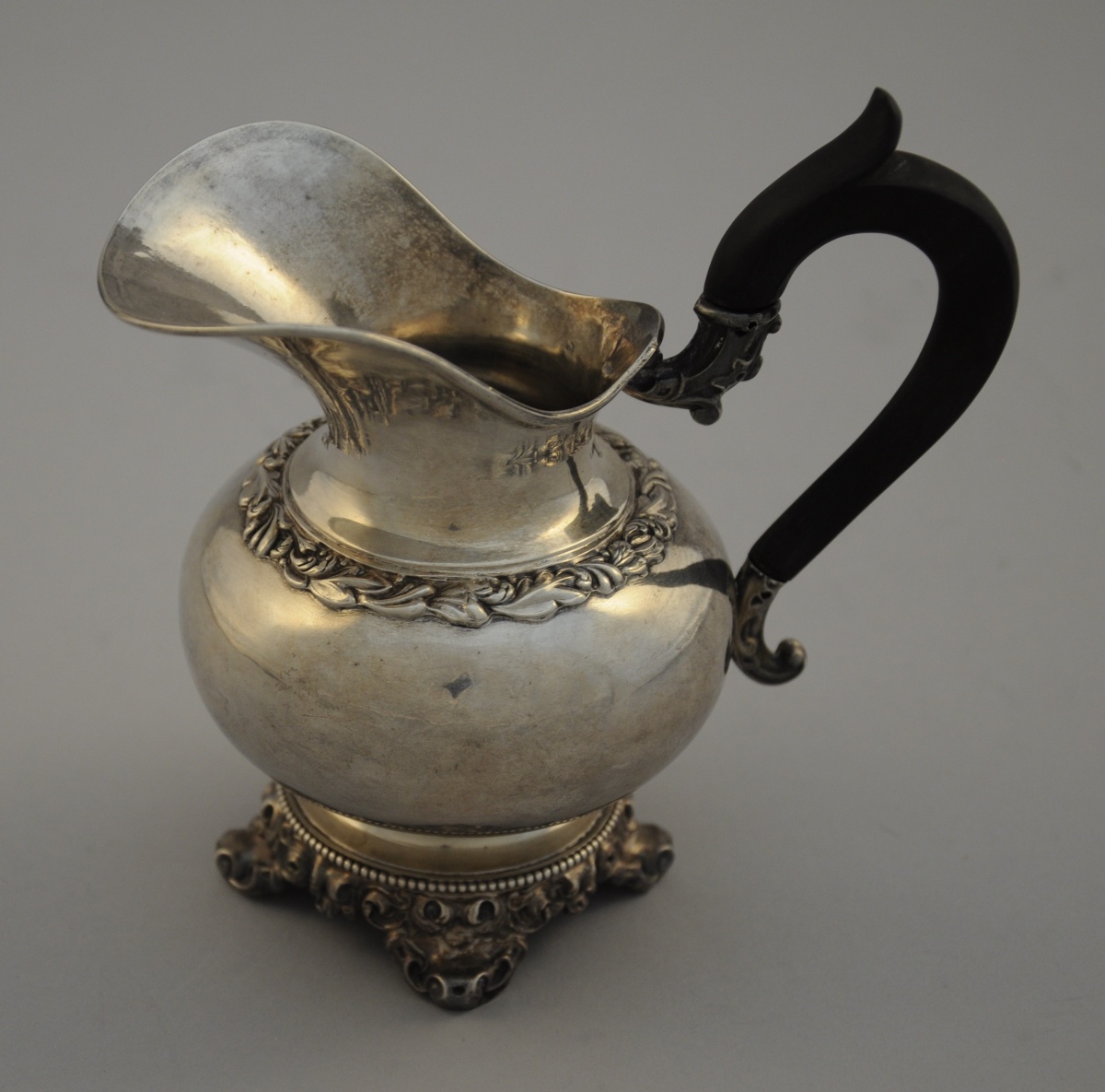 JOINT : POT-À-LAIT à large bec en argent. La panse bombée ornée en partie supérieure d'une frise d'entrelacs feuillagés. Base quadripode ornée d'une frise de rais de perle et d'enroulements. Manche volute en bois noirci. Poinçon Minerve. Style composite, seconde moitié du XIXème.