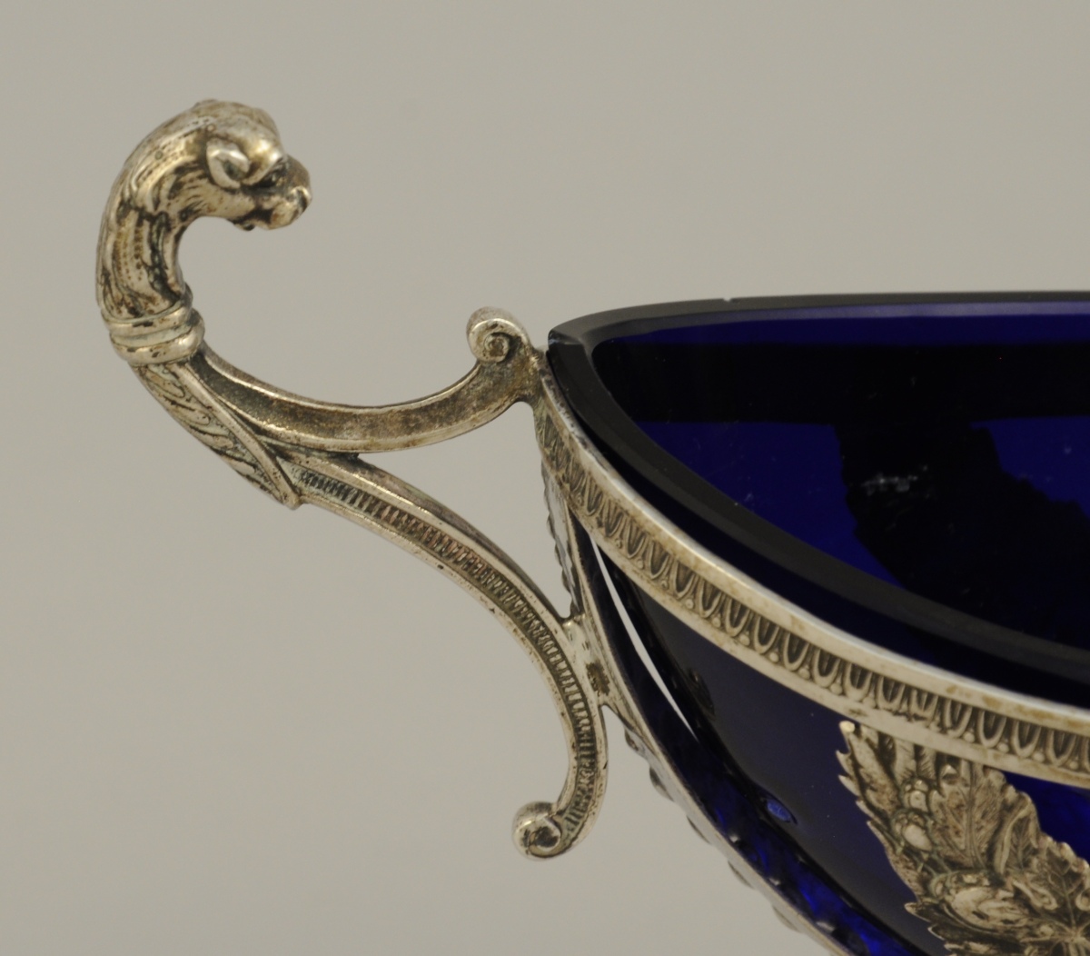 SUÈDE (?) SUCRIER de forme navette en argent. La panse ajourée d'une large guirlande de fruits. Anses latérale à tête de félin et enroulements. Repose sur un piédouche ciselé d'une frise de feuilles d'eau. Réceptacle en verre bleu (petites égrenures).