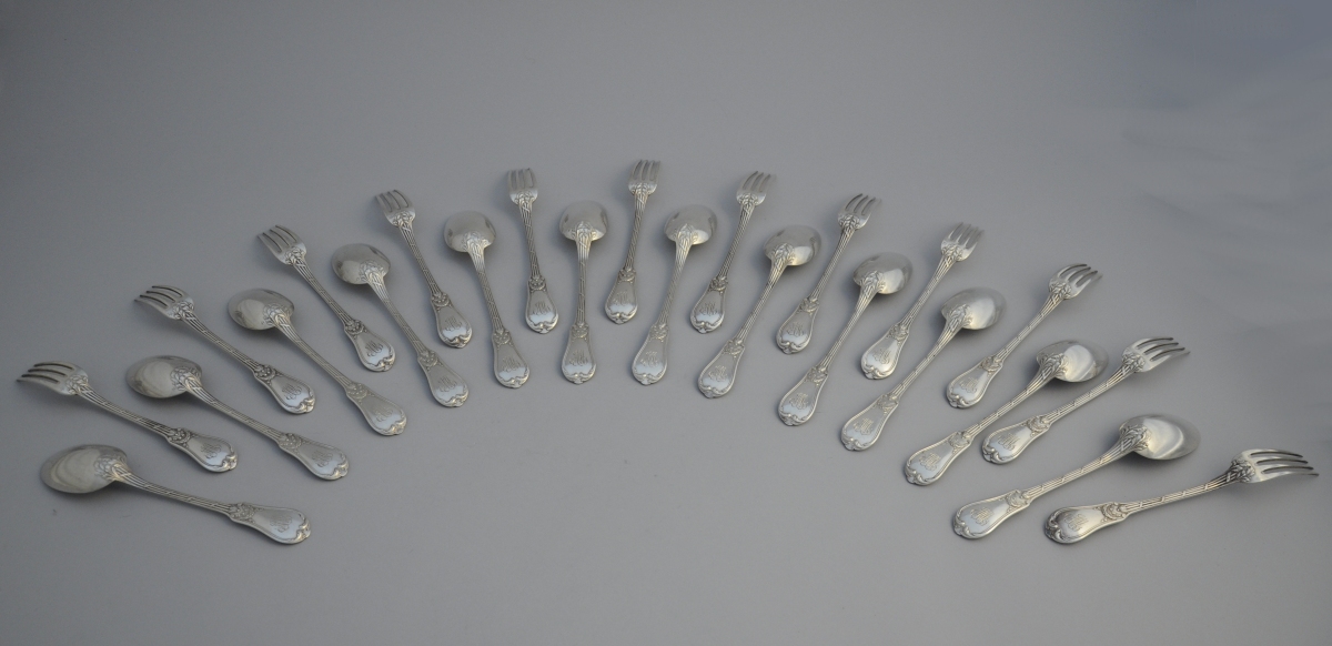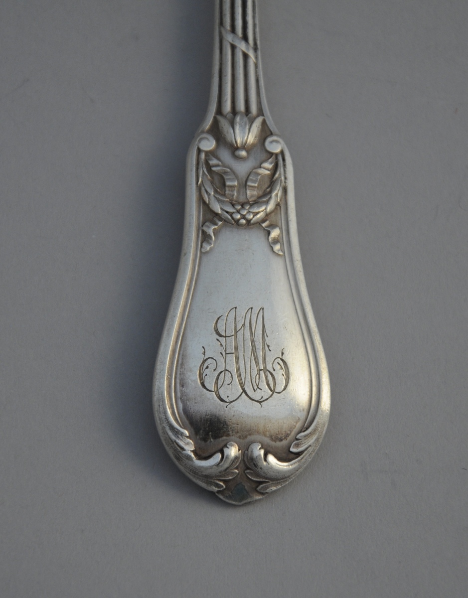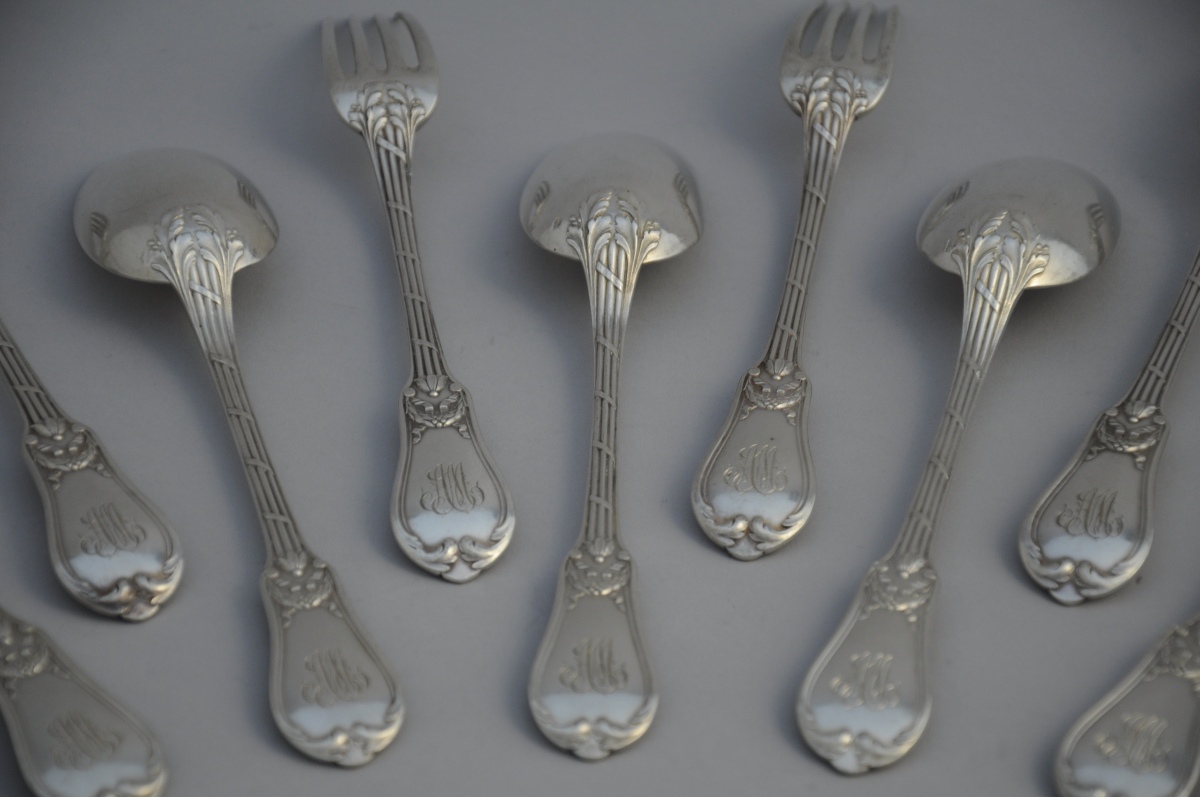 12 COUVERTS en argent, modèle filet-contour. Spatule de forme violonnée et ornée feuilles d'acanthe stylisées, tores de lauriers et joncs rubannés. Monogrammés "A.M.".