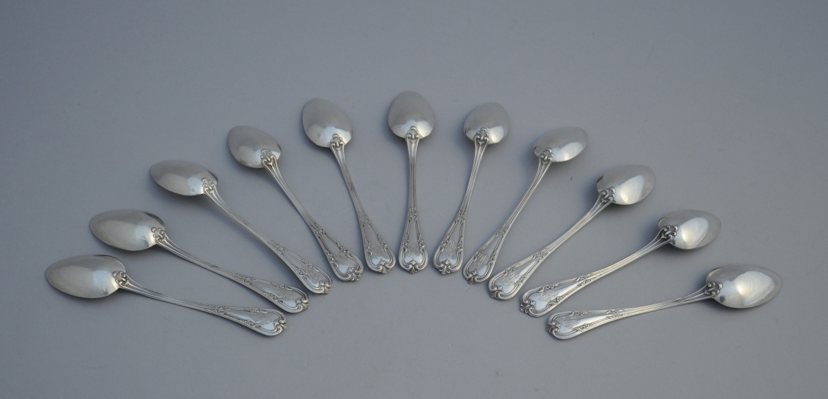 Suite de 11 CUILLÈRES à entremets en argent. Modèle filet à feuilles d'acanthe stylisées et fleurettes. Monogrammées "M.A.".