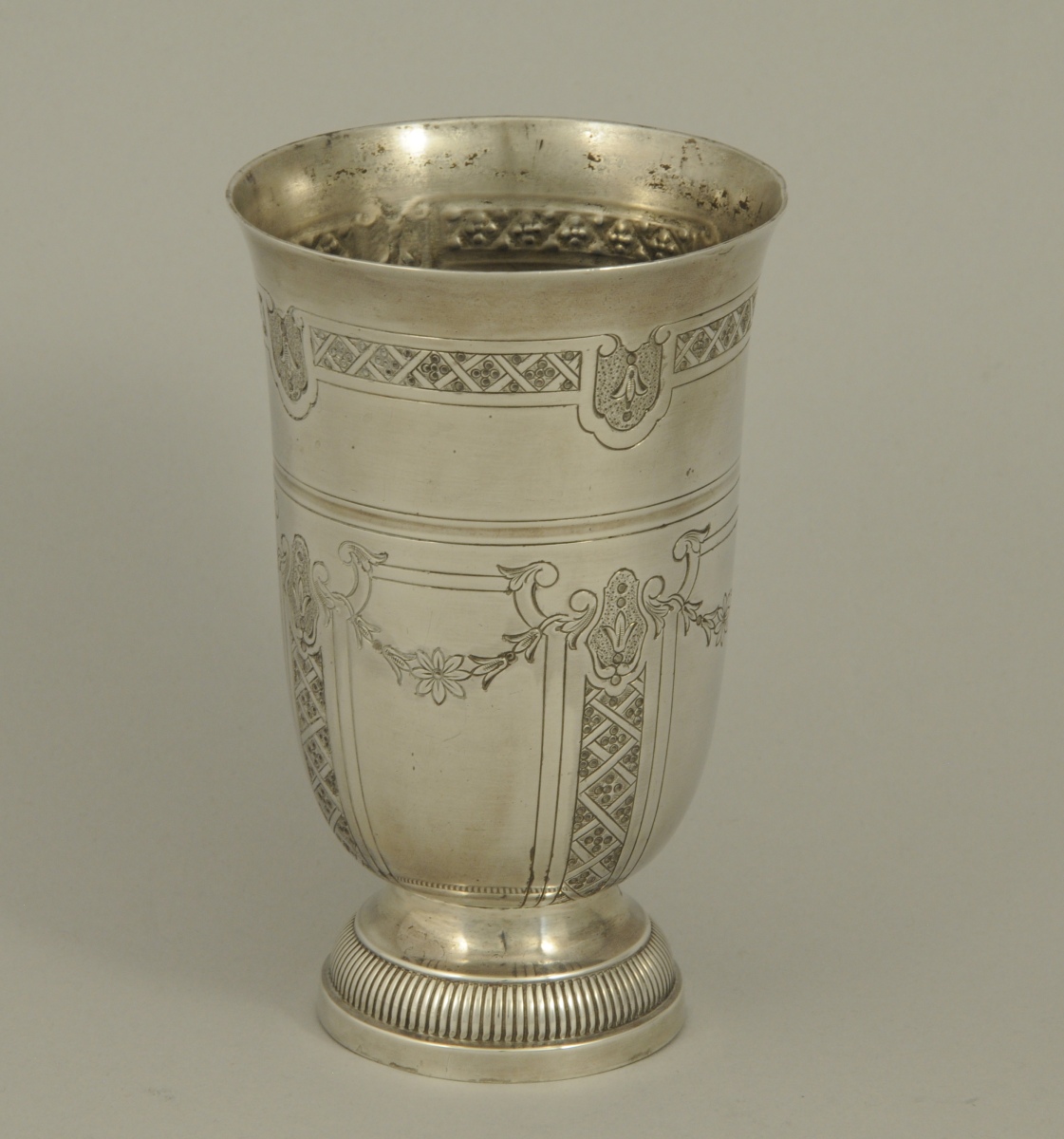 TIMBALE en argent, décor de semis de fleurettes, feuilles d'acanthe stylisées et guirlande de fleurs. Piédouche cannelé.