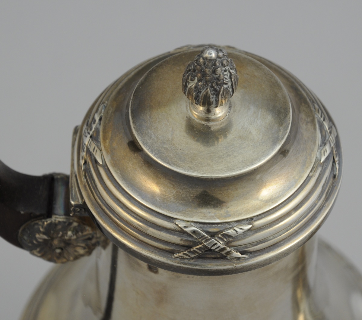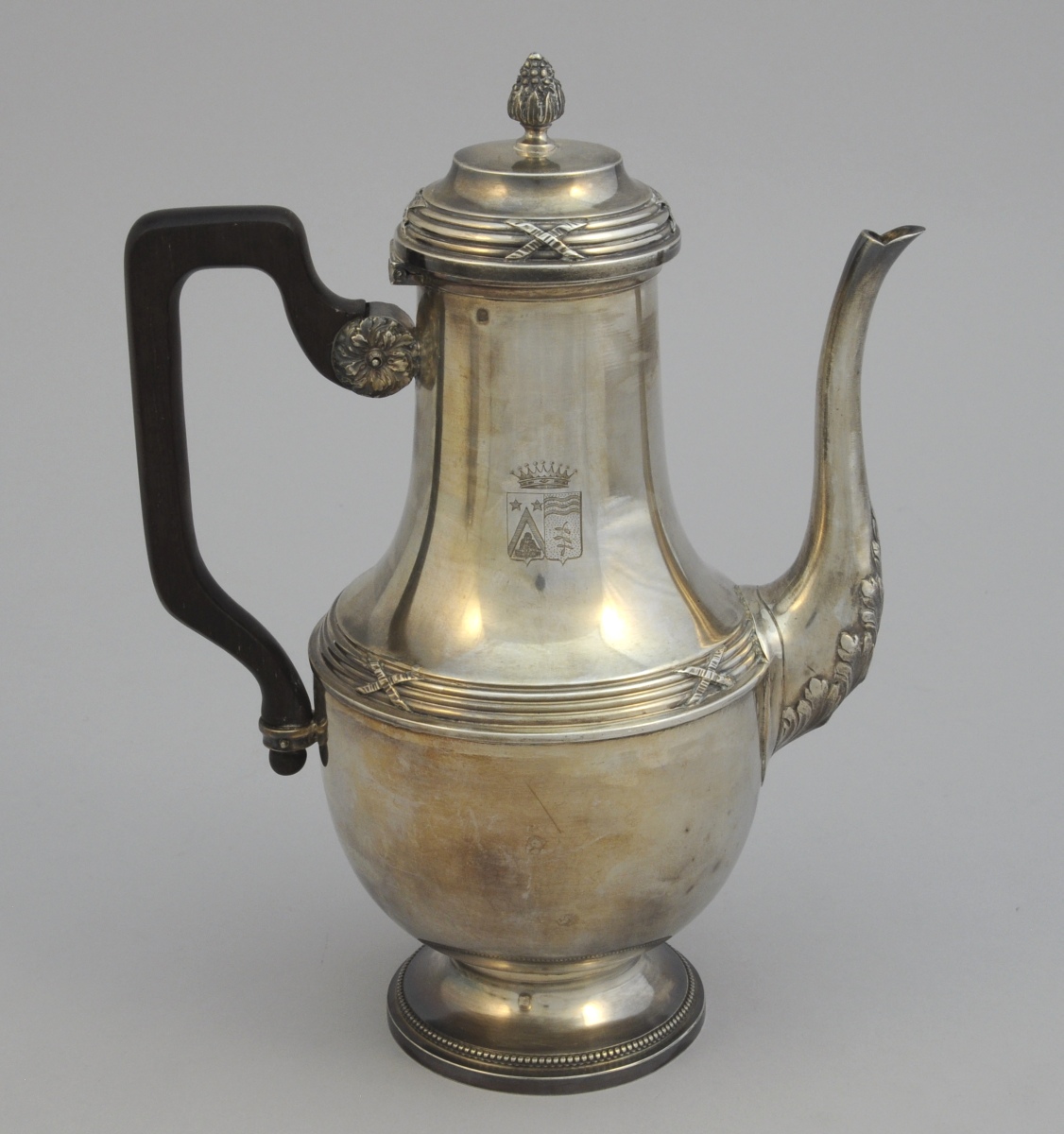 Il se compose d'une théière et d'un sucrier reposant sur un piédouche. Décor de frises de joncs rubannés, rais de perles, et feuilles d'acanthe stylisées. Fretel graine. Armes d'alliance timbrées d'une couronne comtale. Le sucrier à anses latérales à attaches feuillagées et intérieur vermeillé. L'anse de la théière en bois.