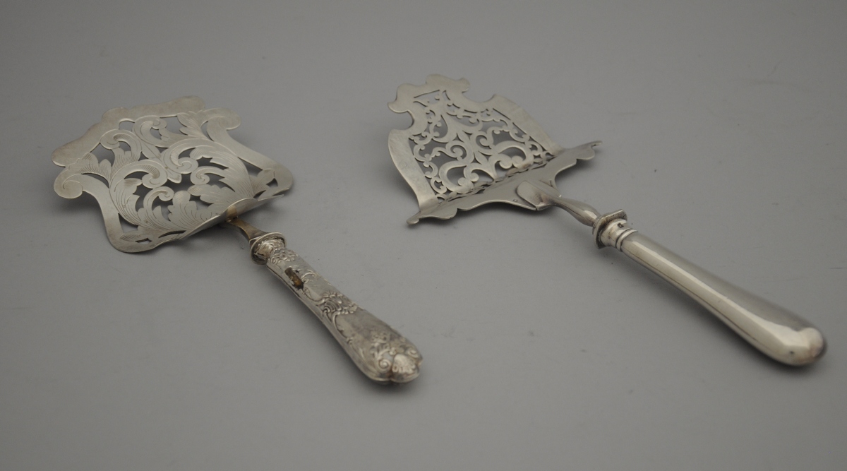 2 PELLES à ASPERGES en métal argenté. Cuilleron ajouré à décor de rinceaux. Manche à agrafes et feuillage stylisé. L'autre à manche lisse.
