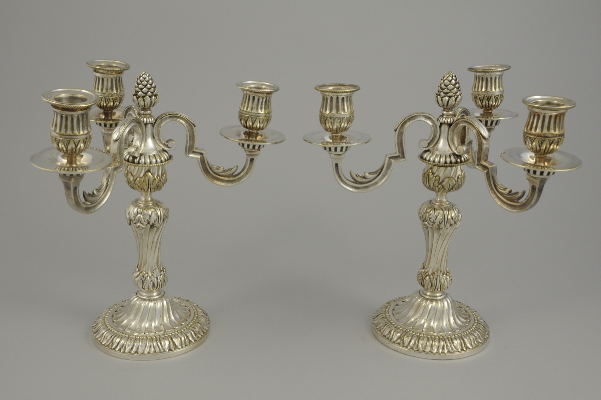 Paire de CANDÉLABRES à trois bras de lumière en métal argenté. Fût torsadé et cannelé à riche ornementation de rais de perles, feuilles d'eau, feuilles d'acanthe stylisées. Bras de lumière amovibles à binets cannelés et ornés de feuilles de lauriers, sommé d'une pomme de pin.