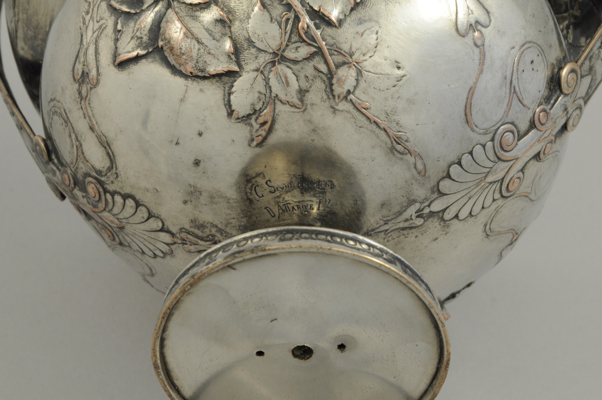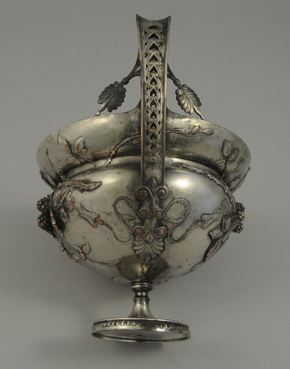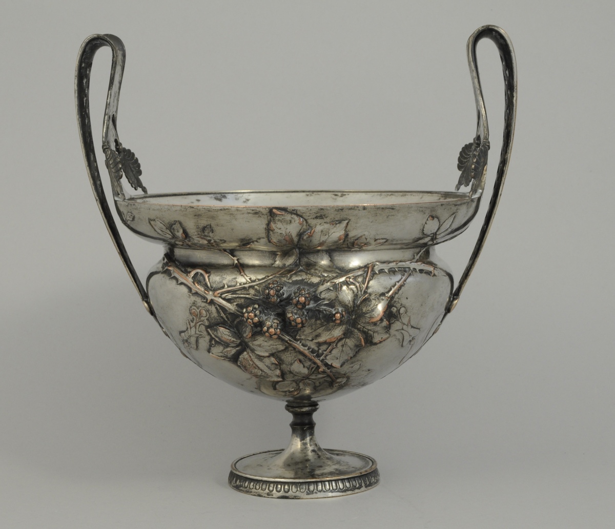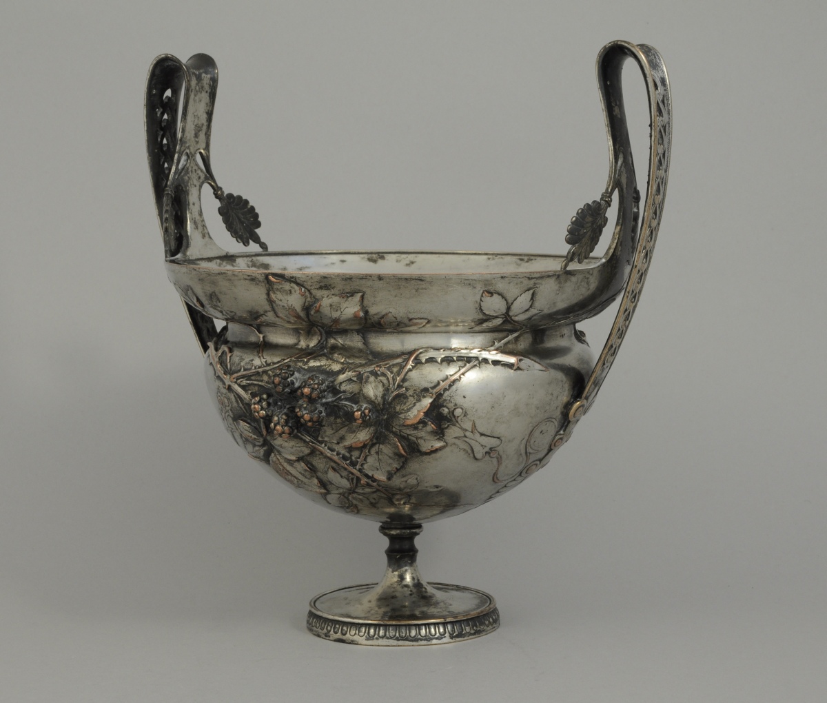 COUPE aux branches de mûrier en bronze et cuivre galvanique argenté. Paire d'anses latérales à décor de frises d'entrelacs et de palmettes. Repose sur un pied godronné. Datée 1865.