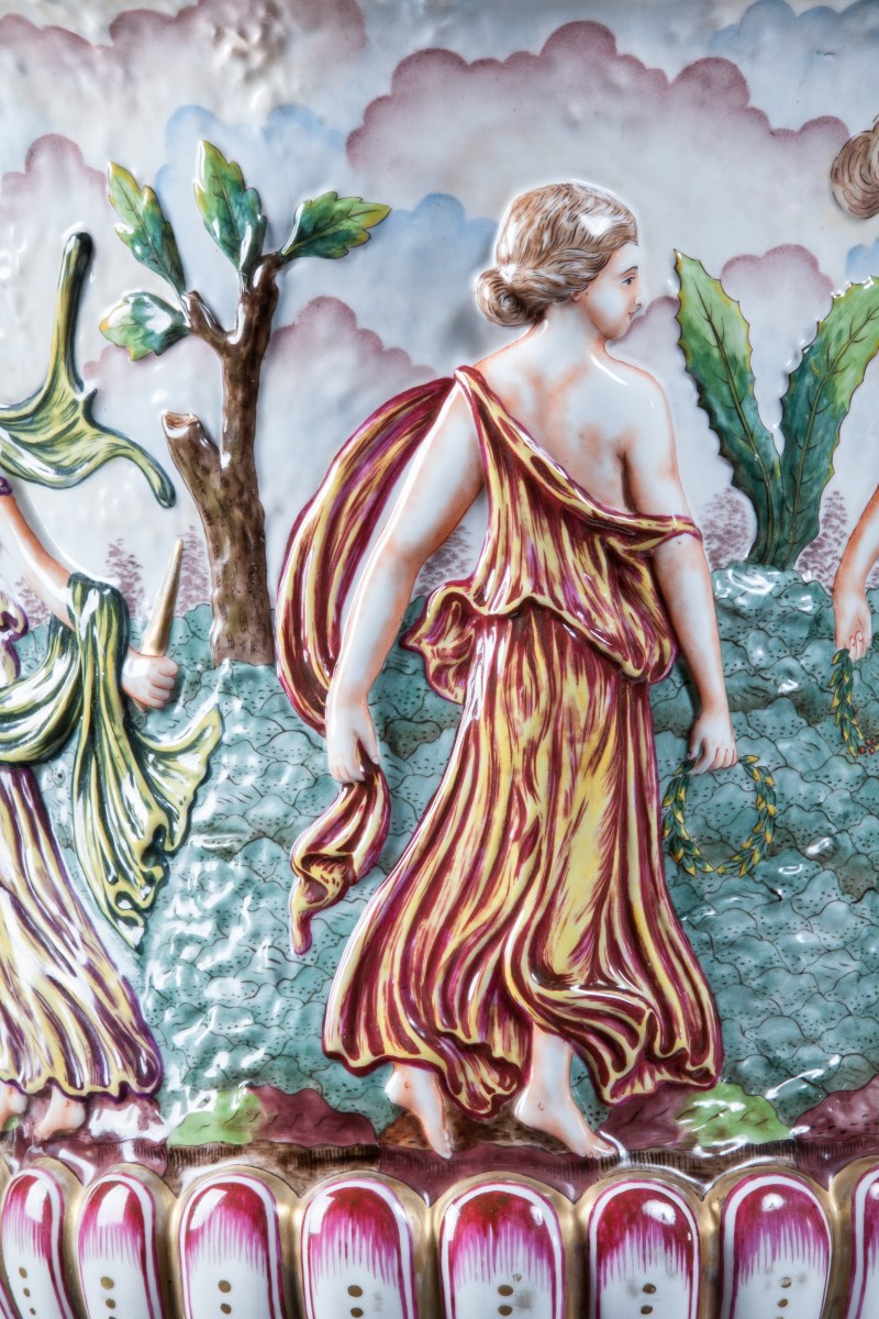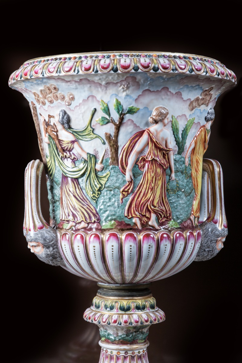 PAIRE de grands VASES MÉDICIS en porcelaine dans le goût de Capodimonte à décor polychrome et doré en haut relief de nymphes, godrons, cannelures et tors de lauriers. Deux anses à agrafes à têtes de faune.