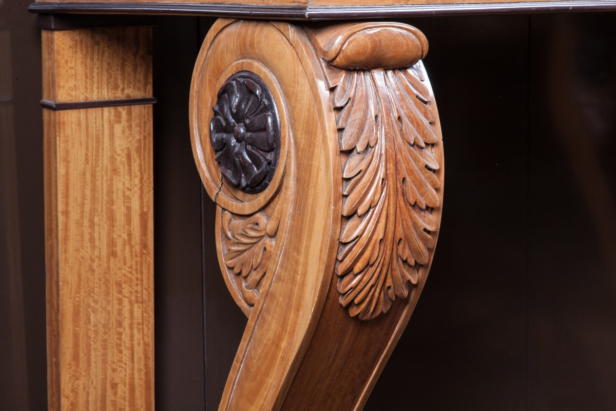 Importante DESSERTE rectangulaire formant jardinière en citronnier, placage de citronnier et bois teinté acajou. Montants antérieurs en console à enroulements et pieds à griffes de lion à décor de feuilles d'acanthe et fleurons. Montants arrières en pilastres. Base socle.