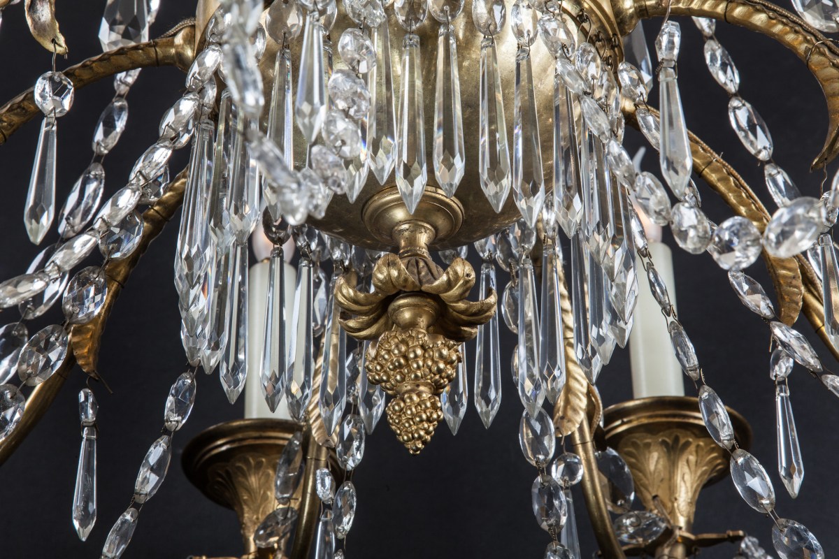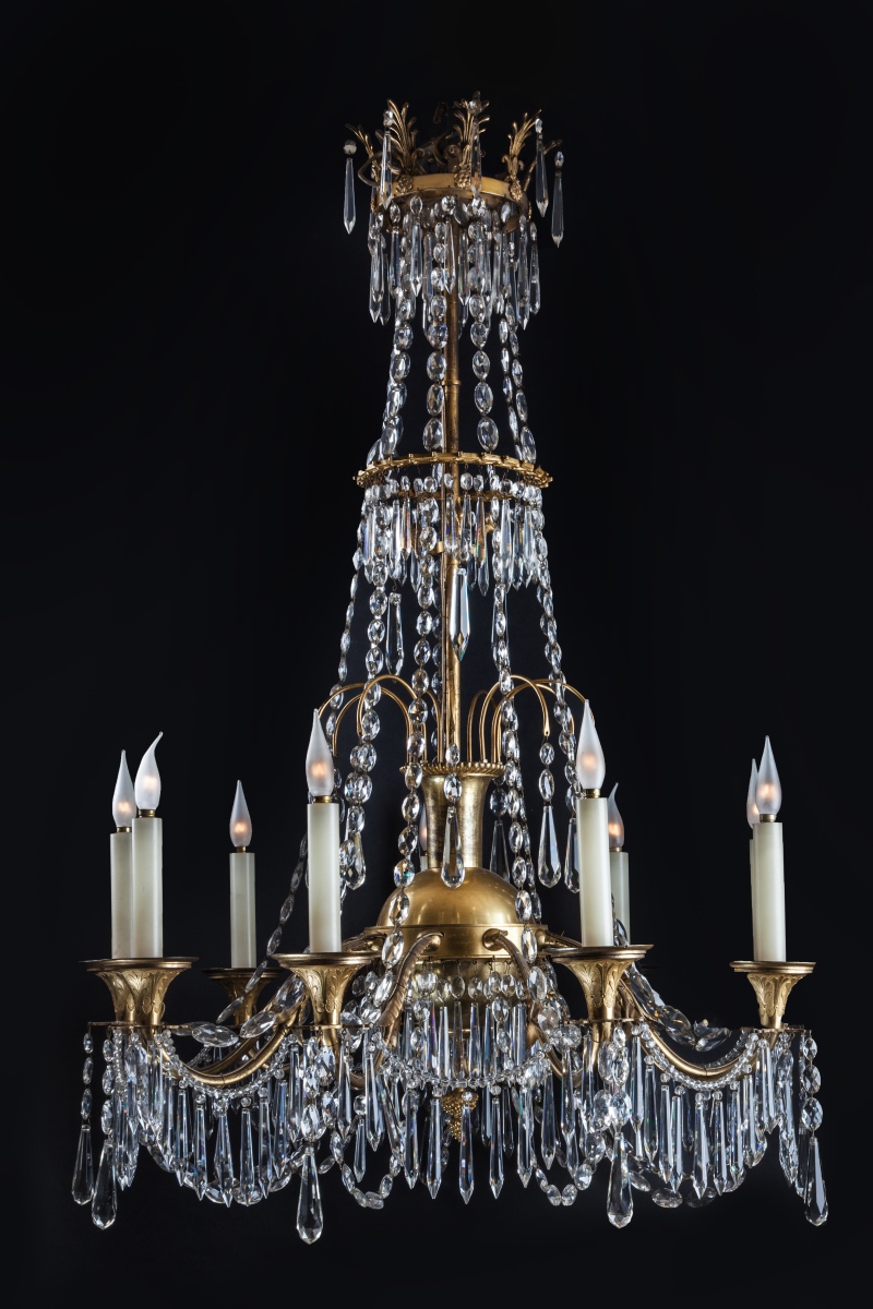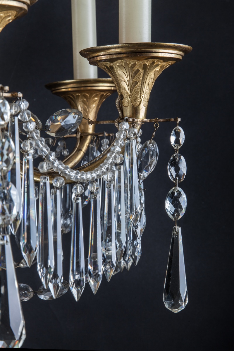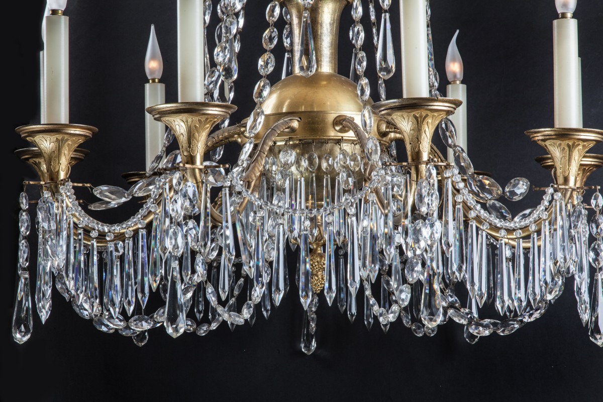 LUSTRE en bronze et laiton doré à neuf bras de lumière feuillagés et binets évasés ornés de palmettes. Fût central en forme de vase surmonté d'une couronne feuillagée. Ornementation d'olives et pampilles en cristal taillé.