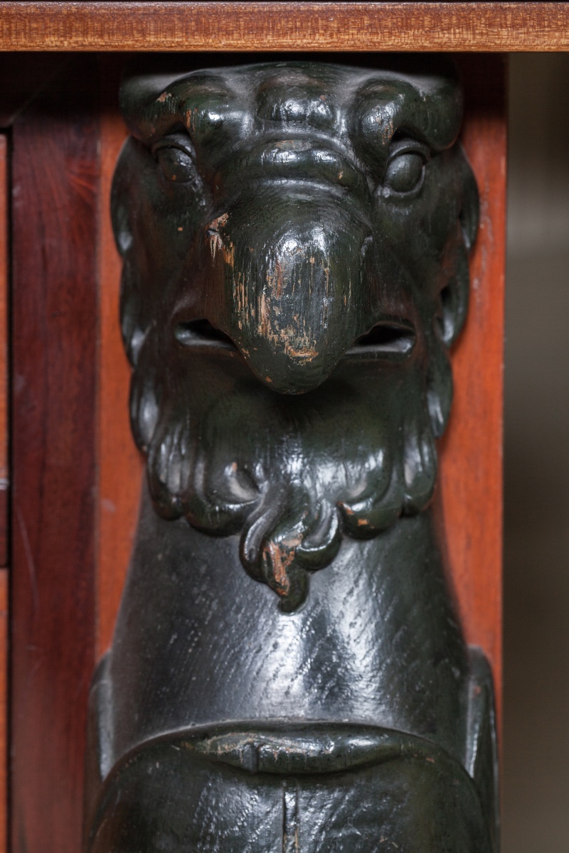 BUREAU MINISTRE double face en acajou rouge et placage d'acajou blond, ouvrant à un tiroir central et sept tiroirs en deux piles. Plateau gainé d'un cuir havane doré aux petits fers. Montants à têtes d'aigles, feuilles de lotus et griffes de lion à l'imitation du bronze patiné. Serrures à " piques ".