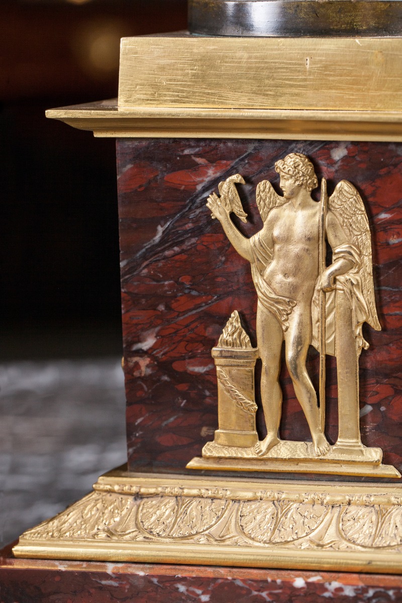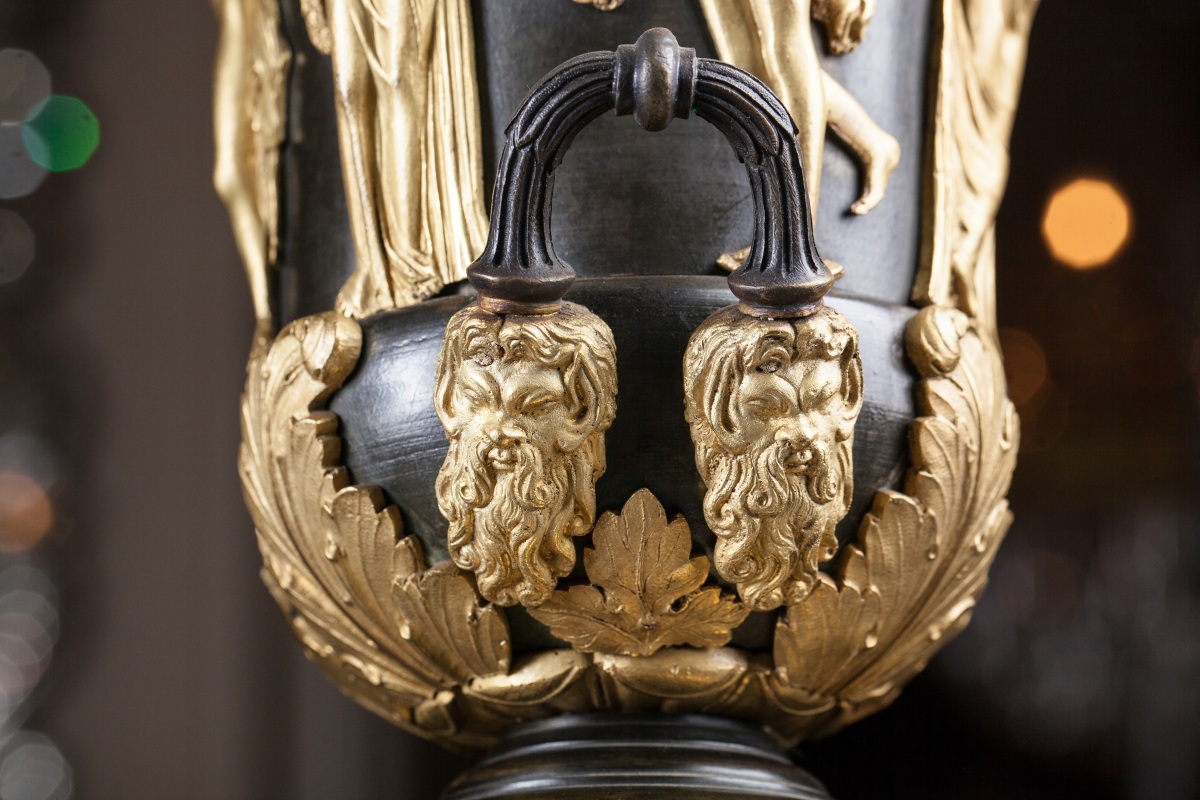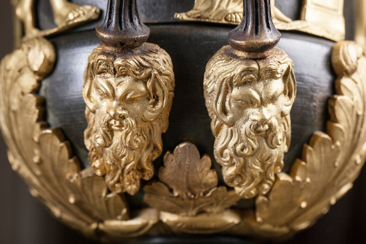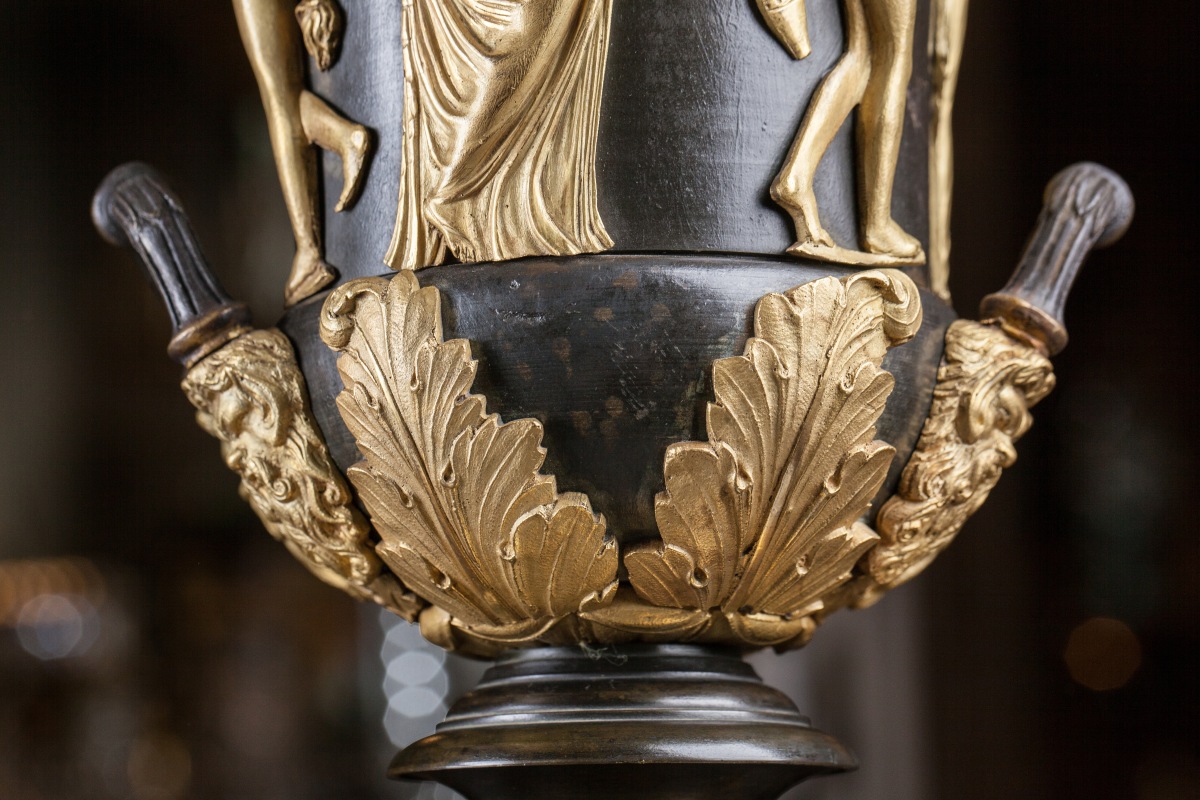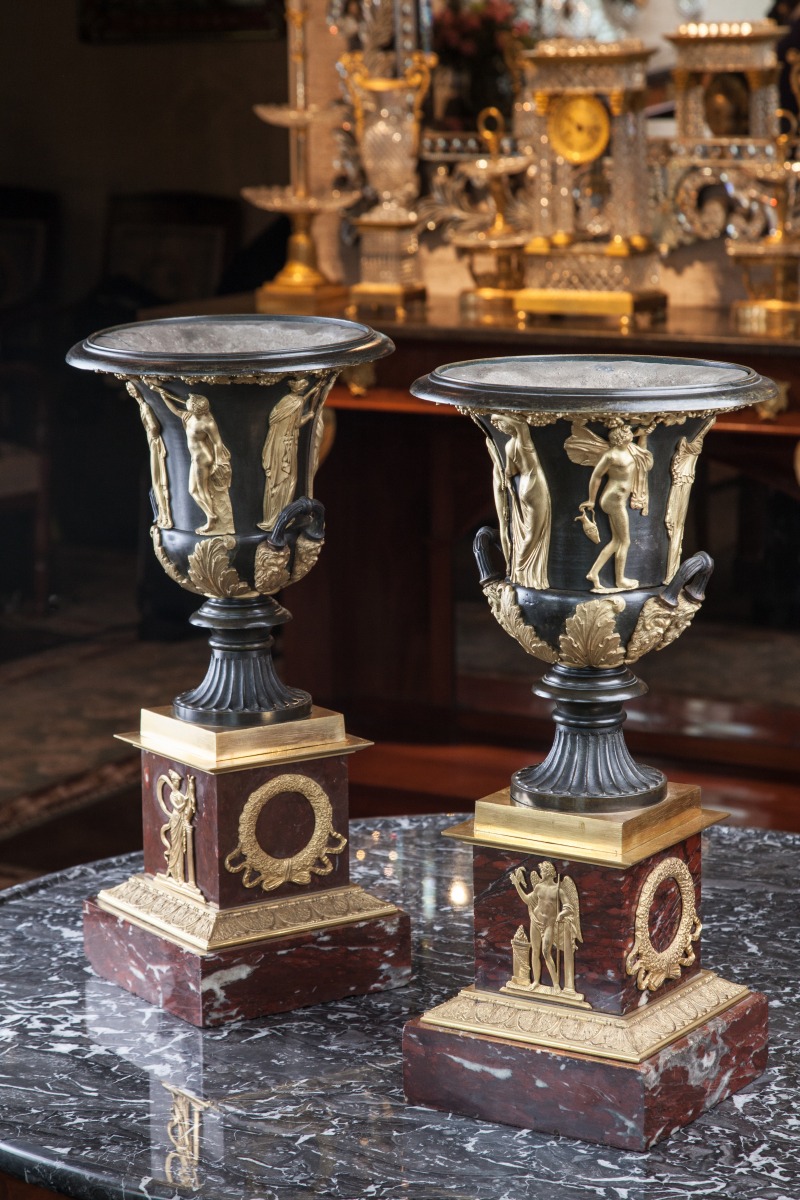 PAIRE de VASES MÉDICIS en bronze patiné ornés de nymphes, vestales, personnages du Panthéon grec, masques de silènes et acanthes en bronze doré. Socle en marbre rouge griotte et bronzes dorés.