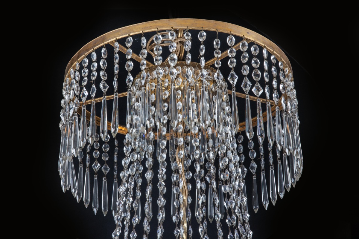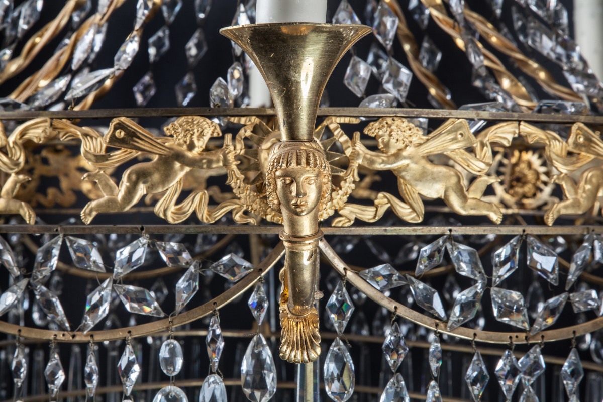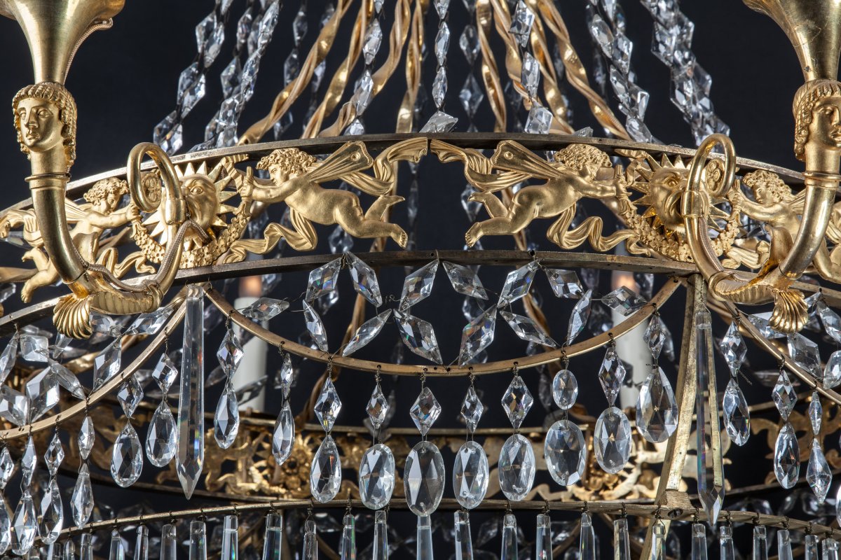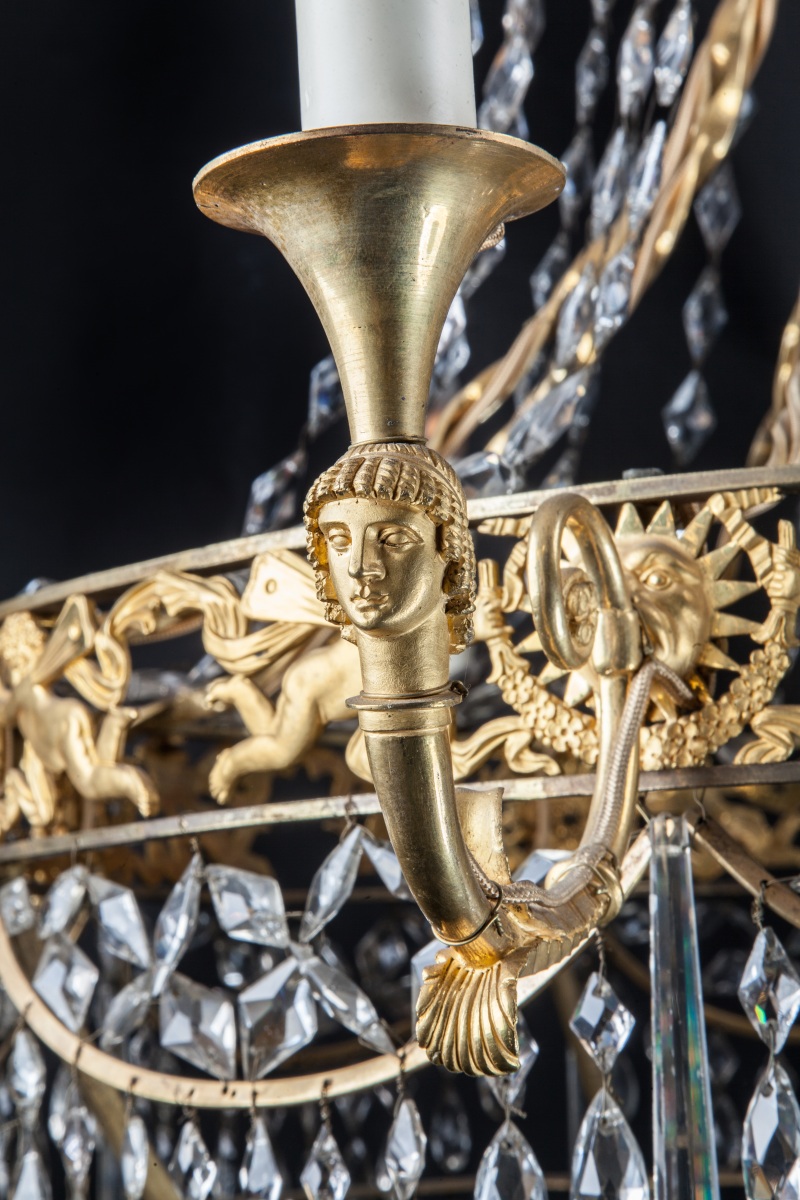 LUSTRE corbeille à six lumières à têtes de personnages à couronne ajourée décorée d'une course de zéphyrs, soleils rayonnants et guirlandes. Ornementation d'olives et pampilles de cristal taillé.