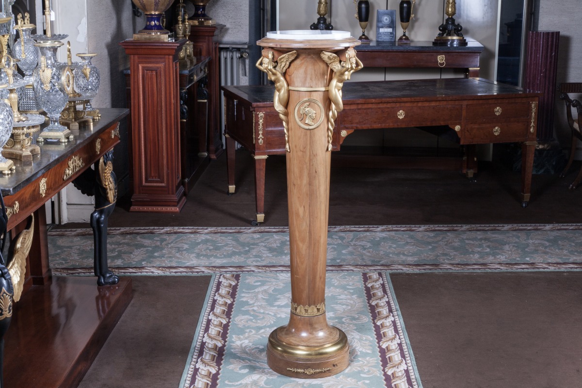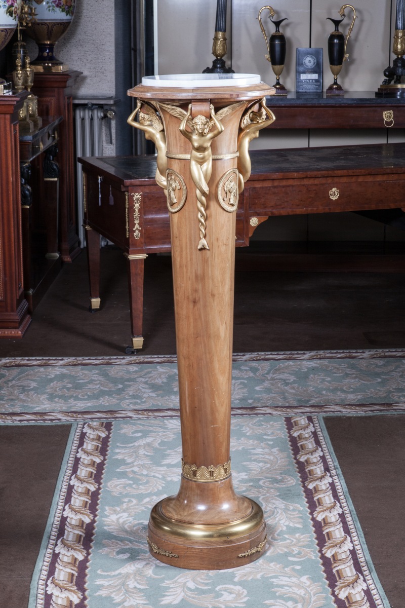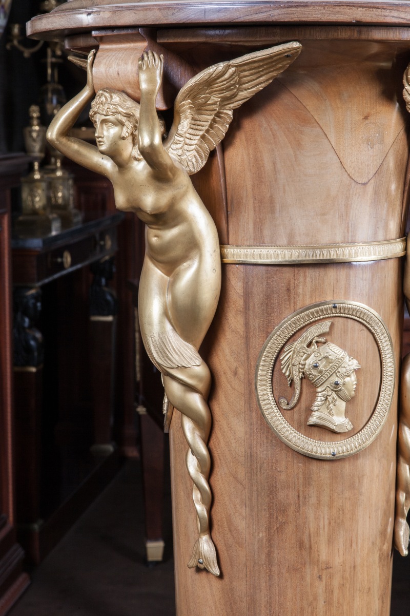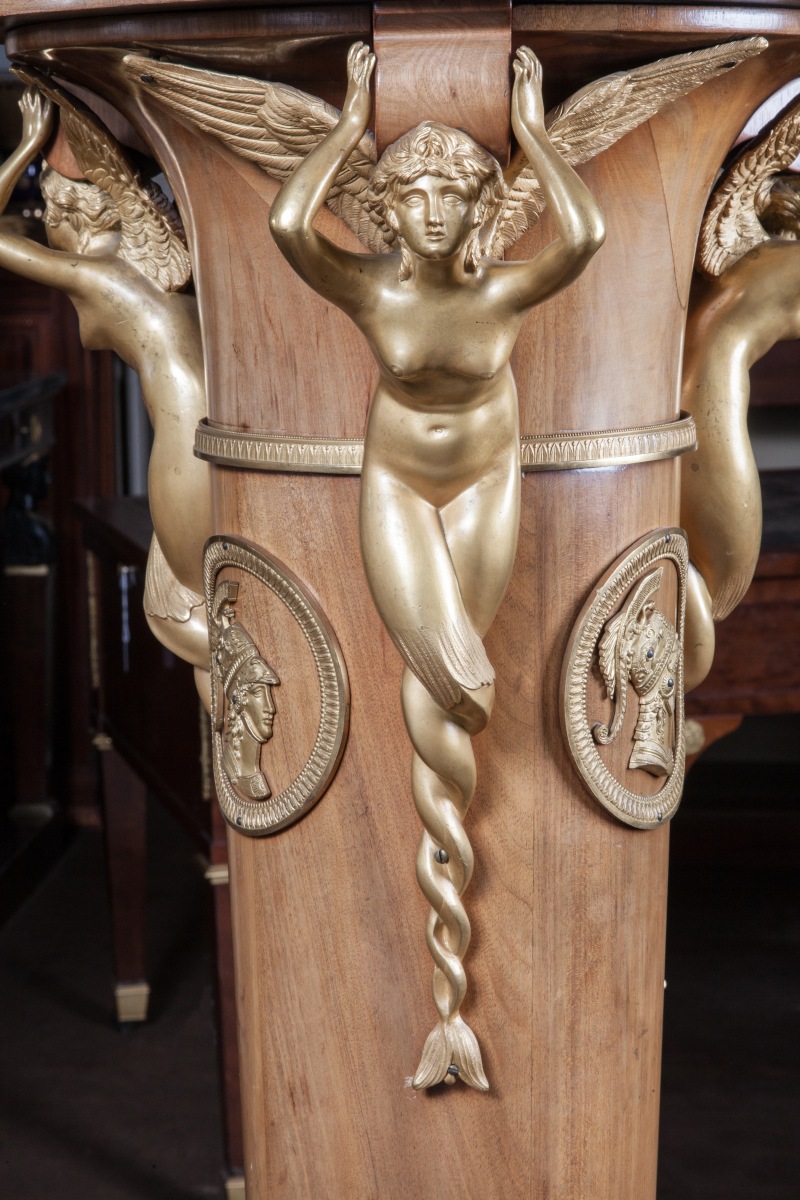 SELLETTE fuselée en placage d'acajou blond, le plateau soutenu par trois sirènes ailées dans le goût de Falconet. Ornementation de médaillons à têtes de Minerve, moulures de feuilles d'eau et palmettes en bronze doré. Dessus de marbre blanc incrusté.