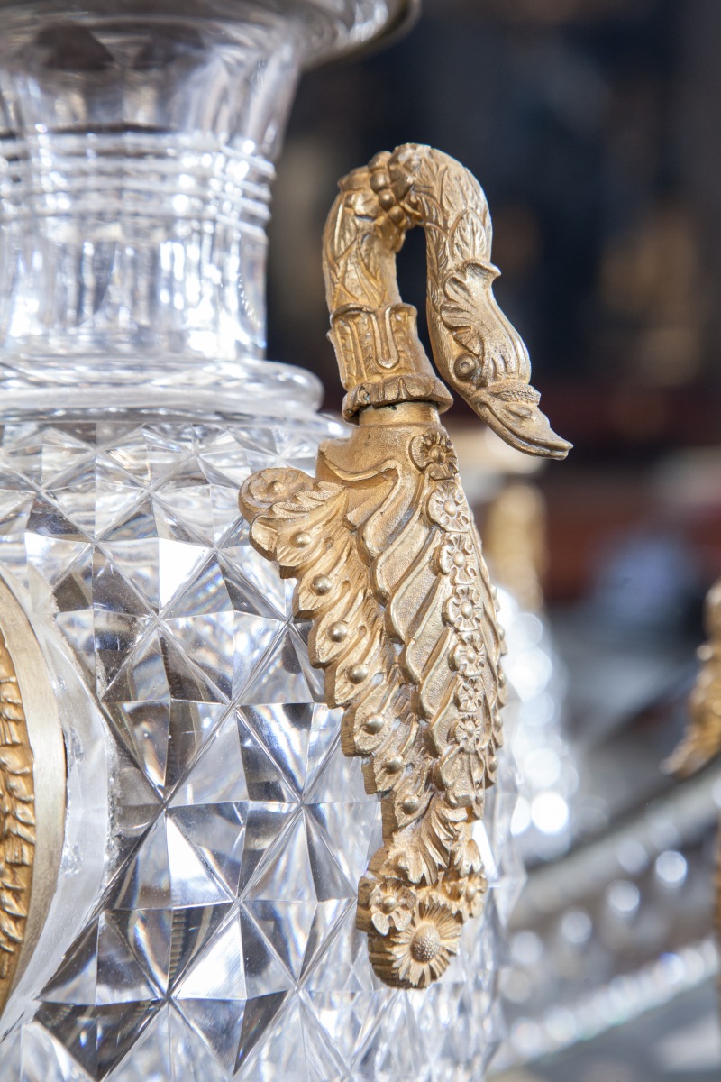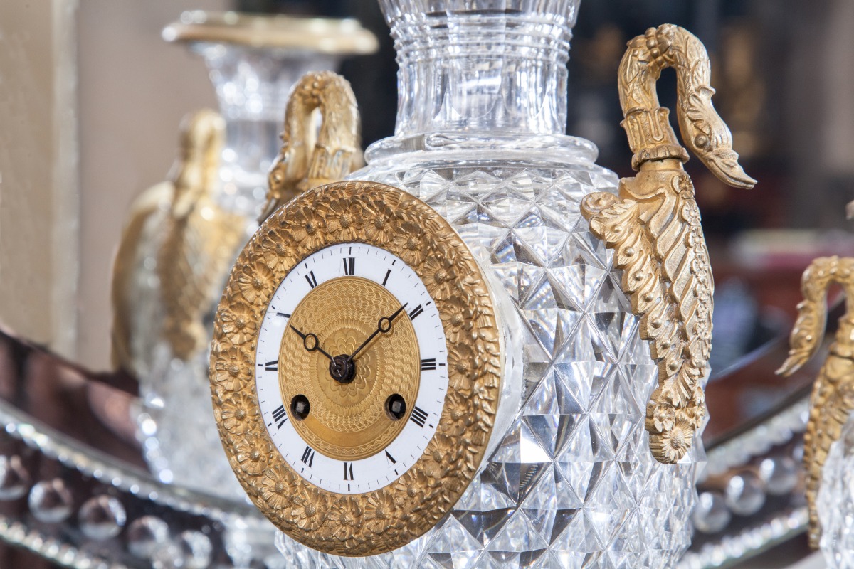 GARNITURE DE CHEMINÉE en forme de vases ovoïdes à piédouche en cristal taillé à pointes de diamant. Monture en bronze doré : anses à col de cygne, base feuillagée. Elle comprend une pendule à cadran d'émail annulaire et deux vases.