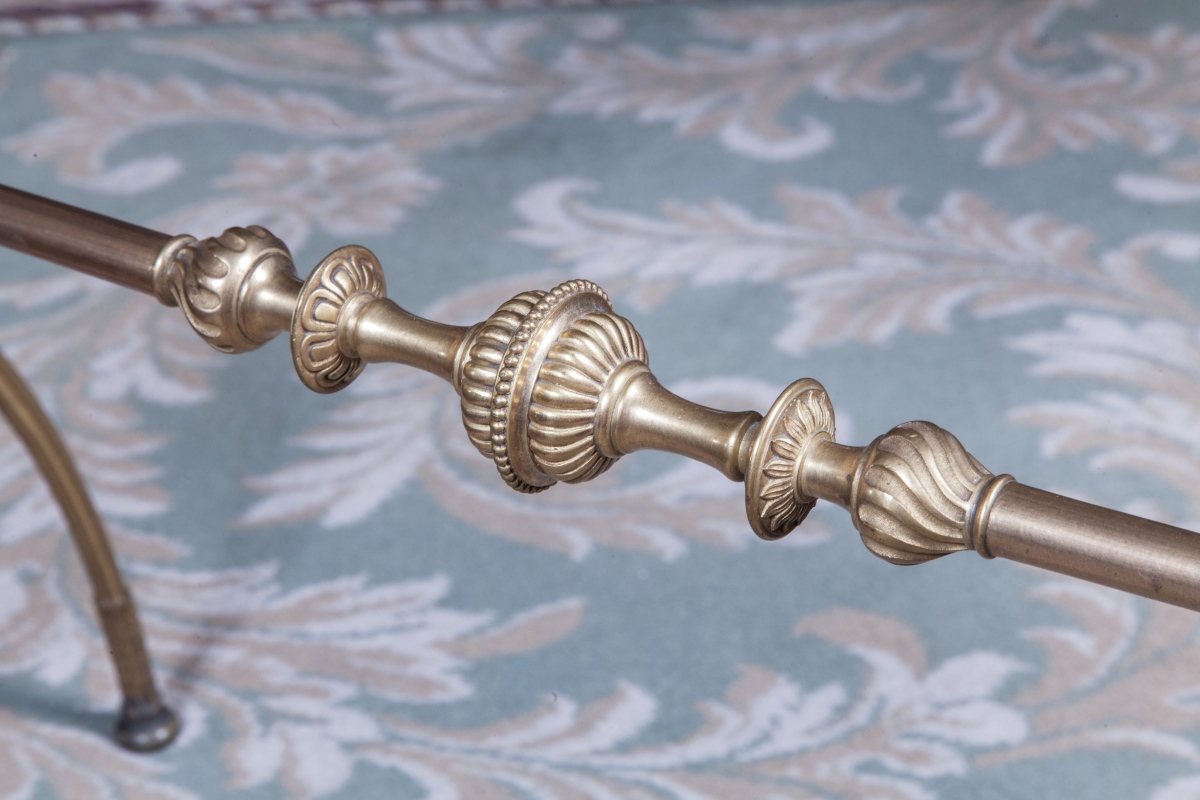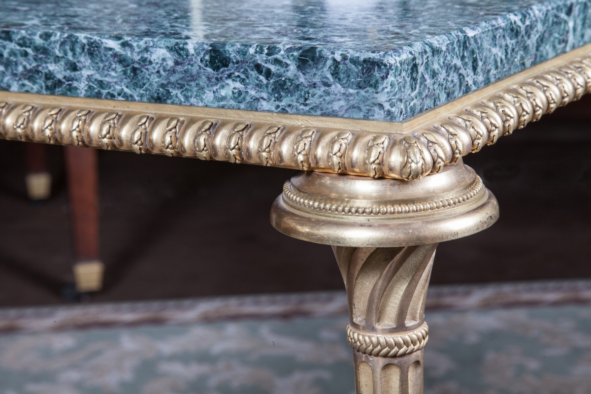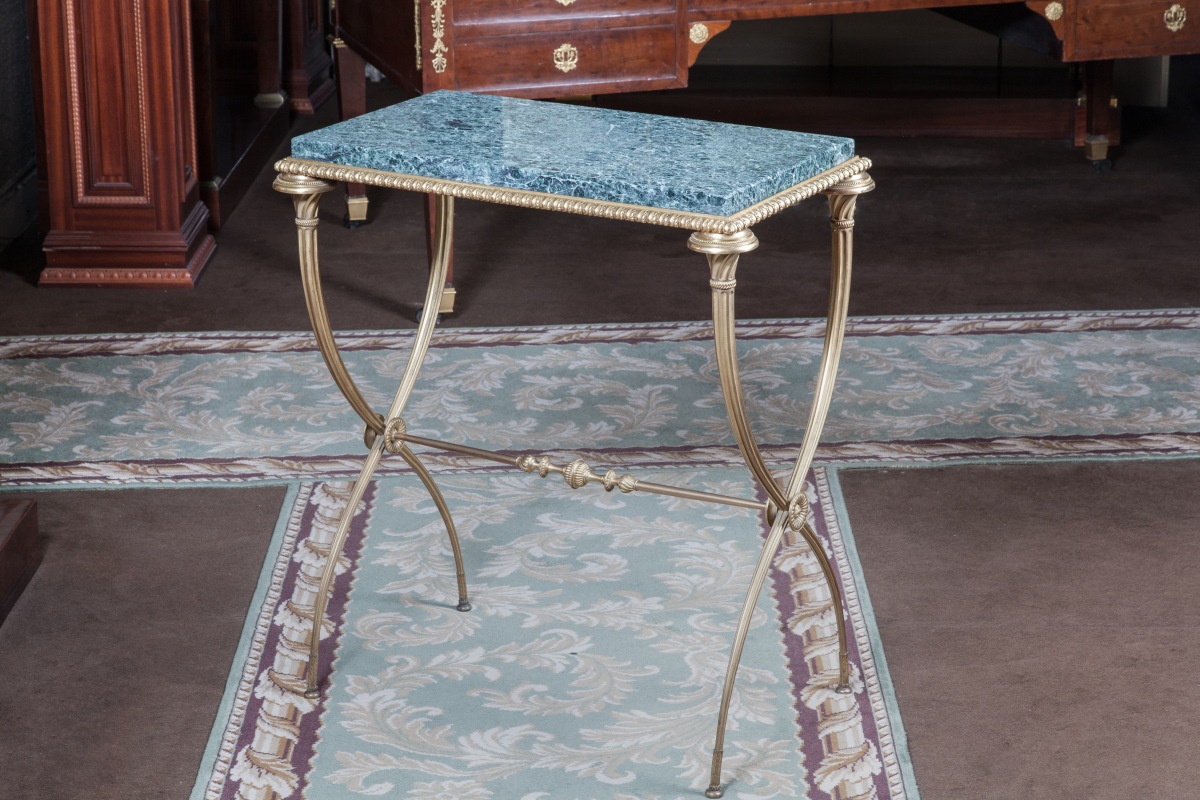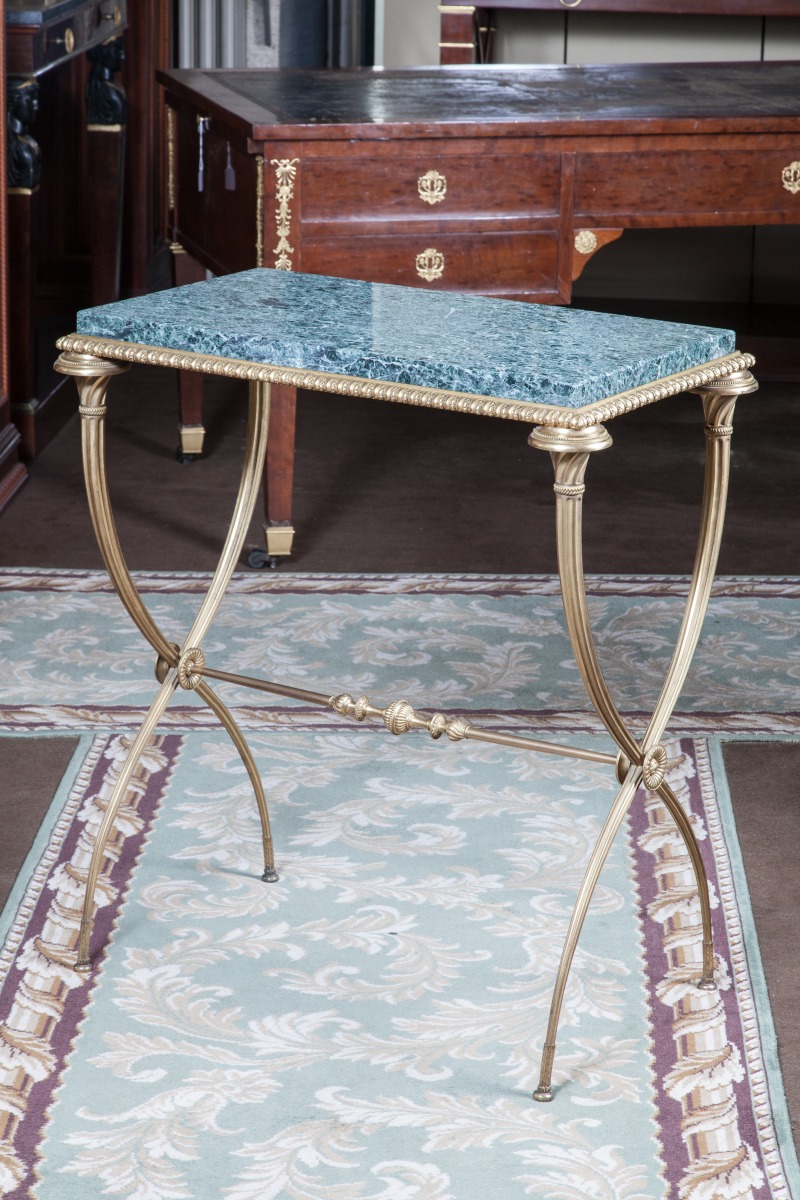 Petite TABLE DE SALON en bronze à piètement X fuselé cannelé à entretoise à nuds godronnés et feuillages. Ceinture à décor de godrons feuillagés. Dessus de marbre vert de mer.