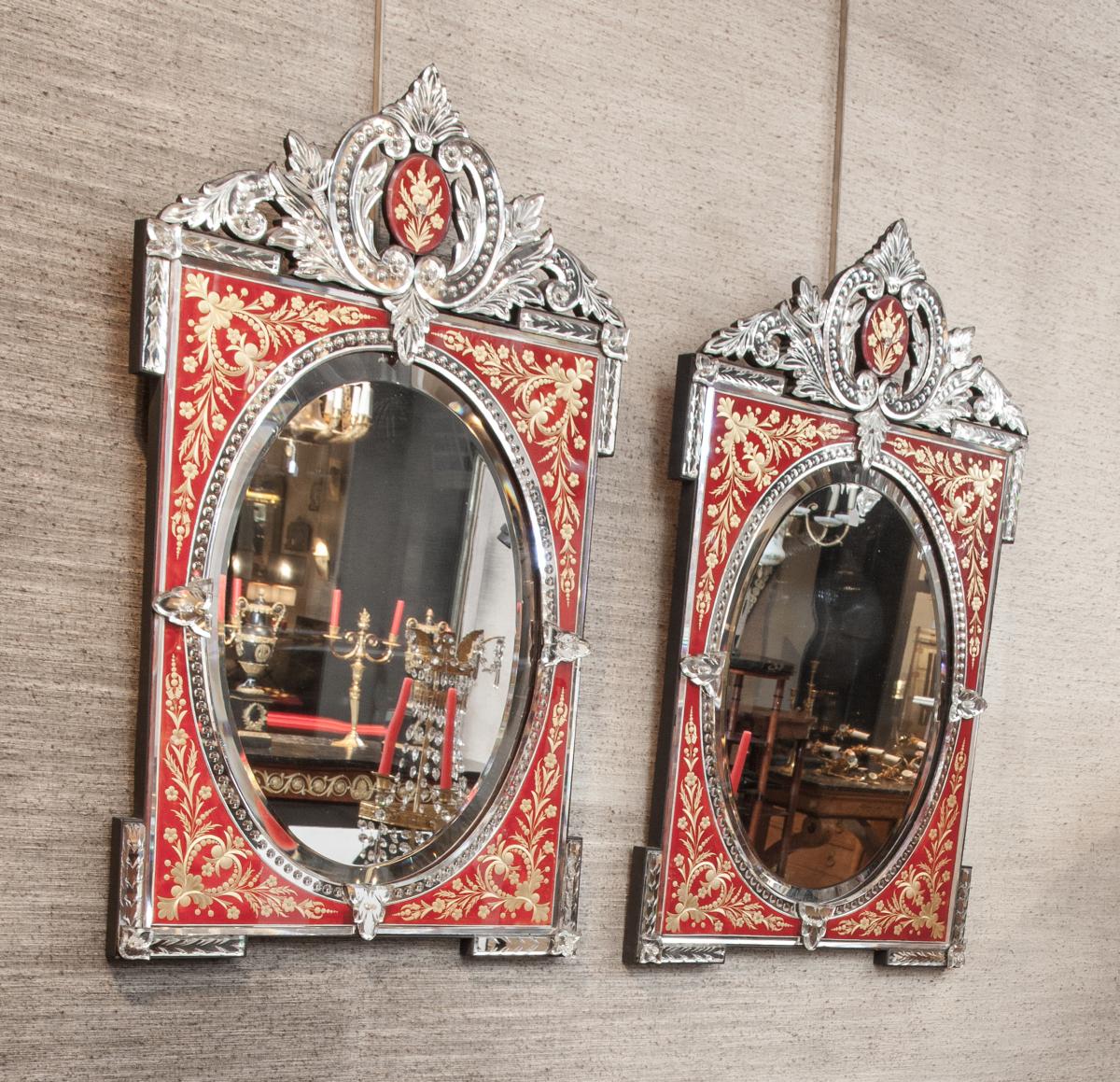 PAIRE de MIROIRS "de VENISE" ovales biseautés dans un encadrement rectangulaire en verre églomisé et gravé à fond rouge. Fronton ajouré orné de palmettes.
