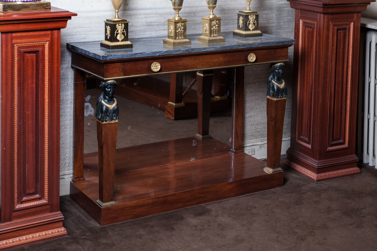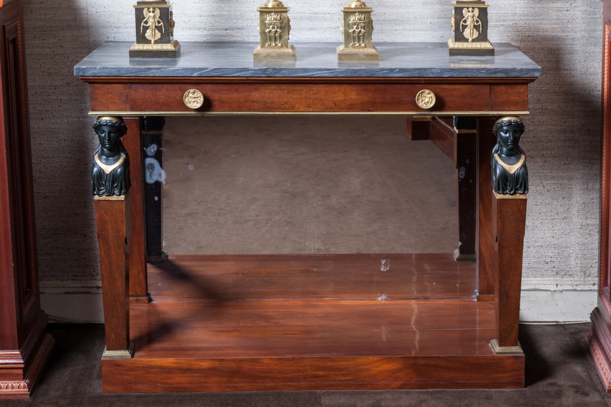 CONSOLE d'APPLIQUE rectangulaire en placage d'acajou ouvrant à un tiroir. Montants antérieurs en cariatides en gaine en bois patiné et doré. Fond de glace à montants en pilastres sur une base socle. Dessus de marbre bleu turquin.