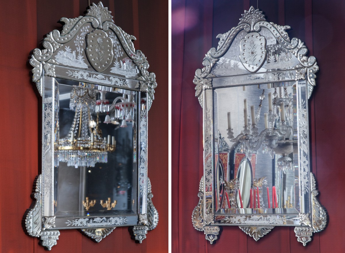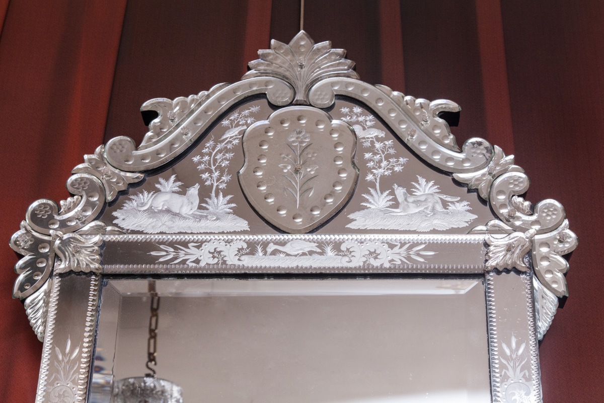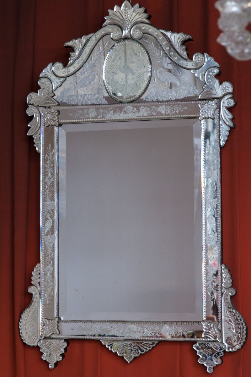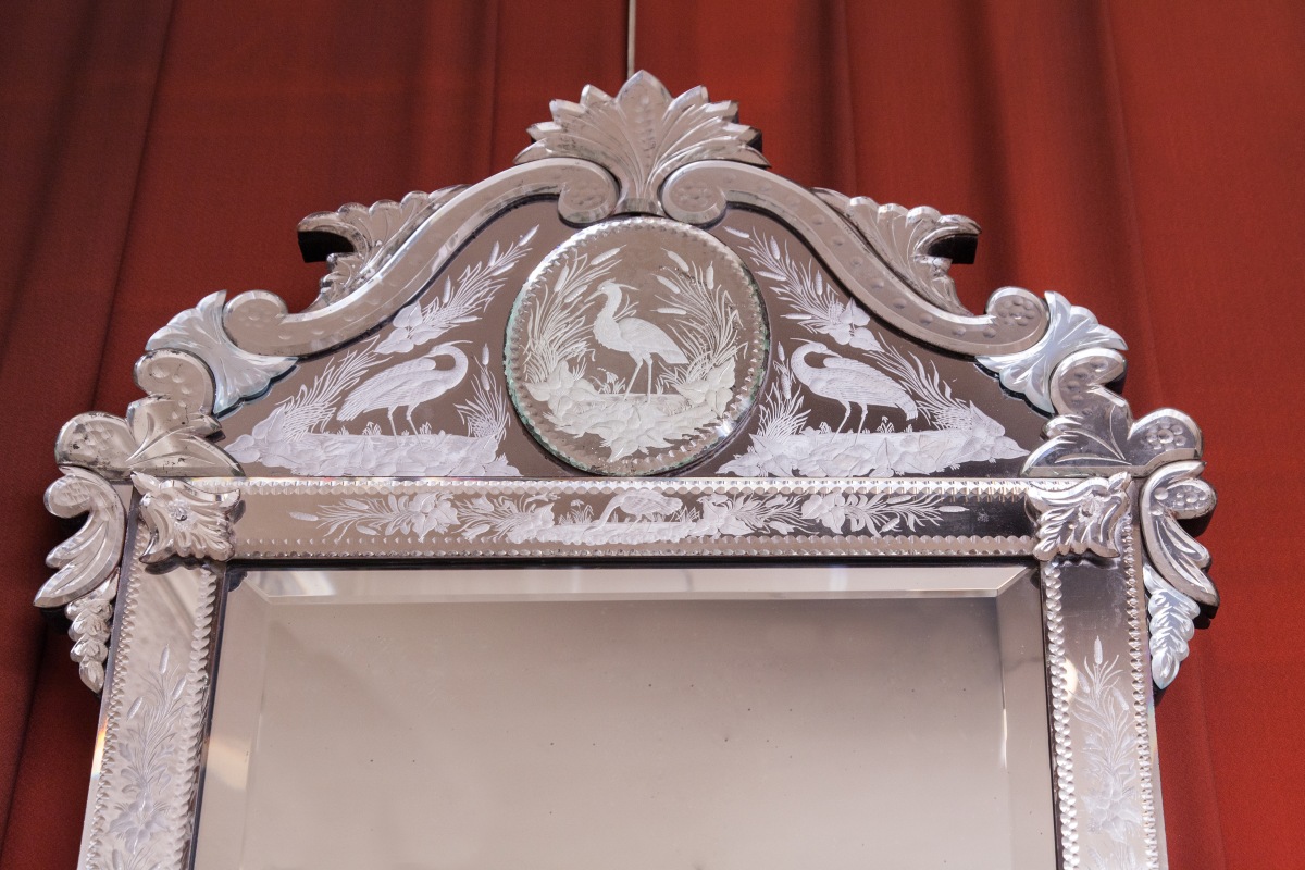 Deux MIROIRS "de VENISE" formant pendant, à fronton de glace taillée et gravée, à décor de volatiles, fleurs, roseaux, renards…