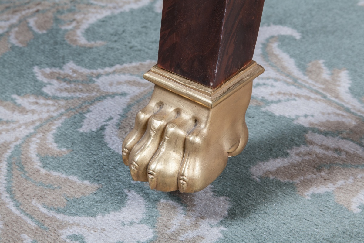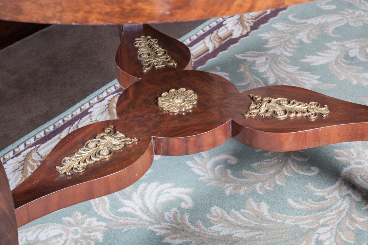 GUÉRIDON en placage d'acajou flammé à trois montants en console à griffes de lion à entretoise mouvementée. Ornementation de bronzes dorés : palmettes, acanthes, couronnes de fleurs (rapportés). Dessus de marbre gris Sainte Anne (réparé).