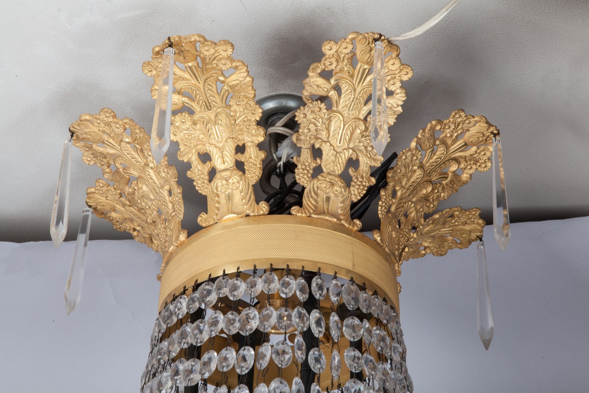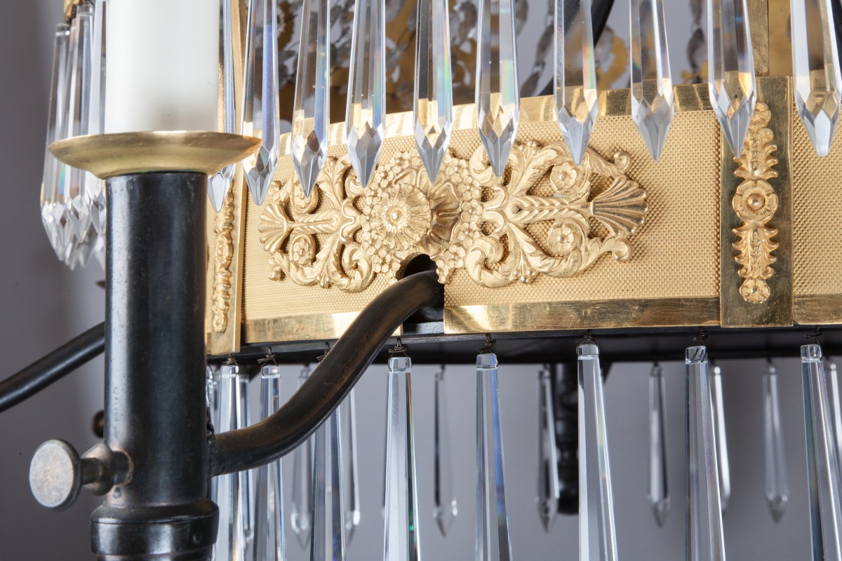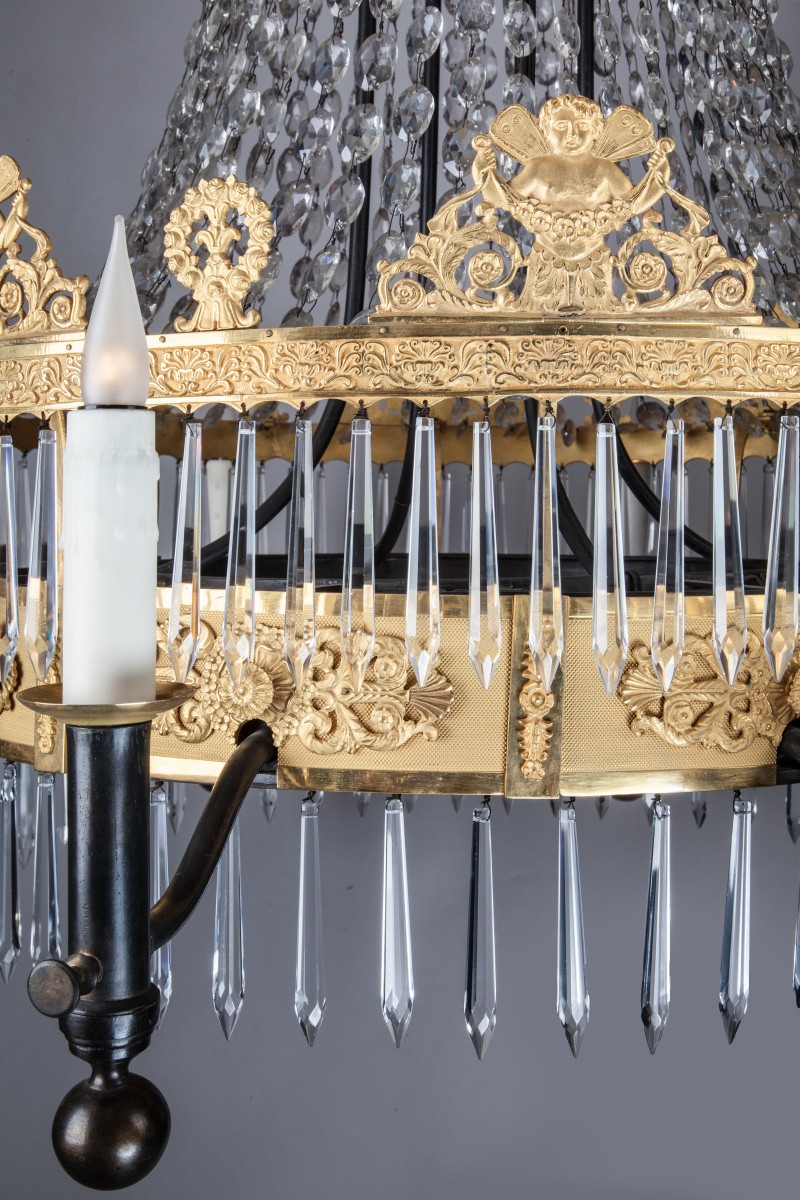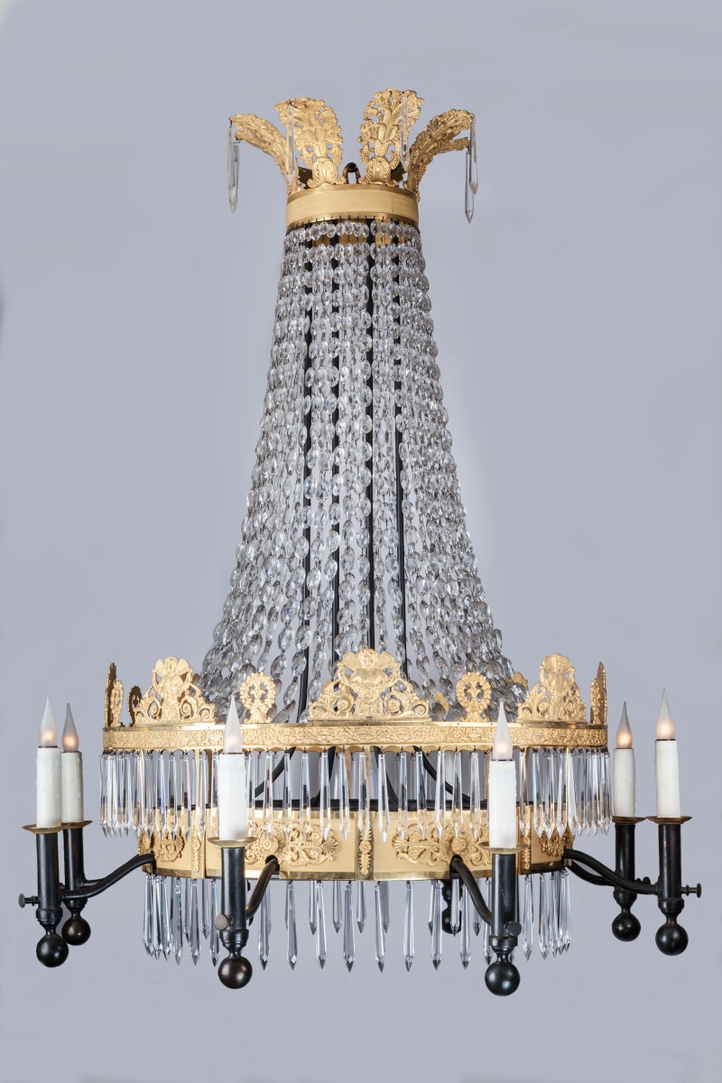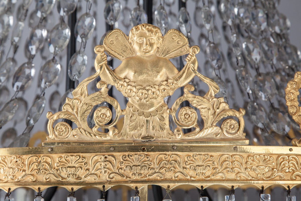 LUSTRE couronne à huit quinquets en bronze doré et tôle patinée à décor de zéphyrs, guirlandes de fleurs, palmettes et volutes feuillagées, orné de perles taillées et pampilles de cristal.