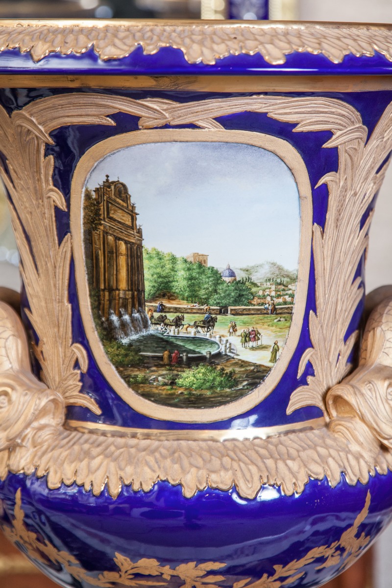PAIRE de grands VASES MÉDICIS en porcelaine à fond bleu nuit ornés de roseaux et dauphins dorés, et de paysages italiens et vases fleuris dans des médaillons.