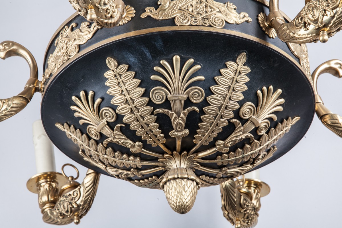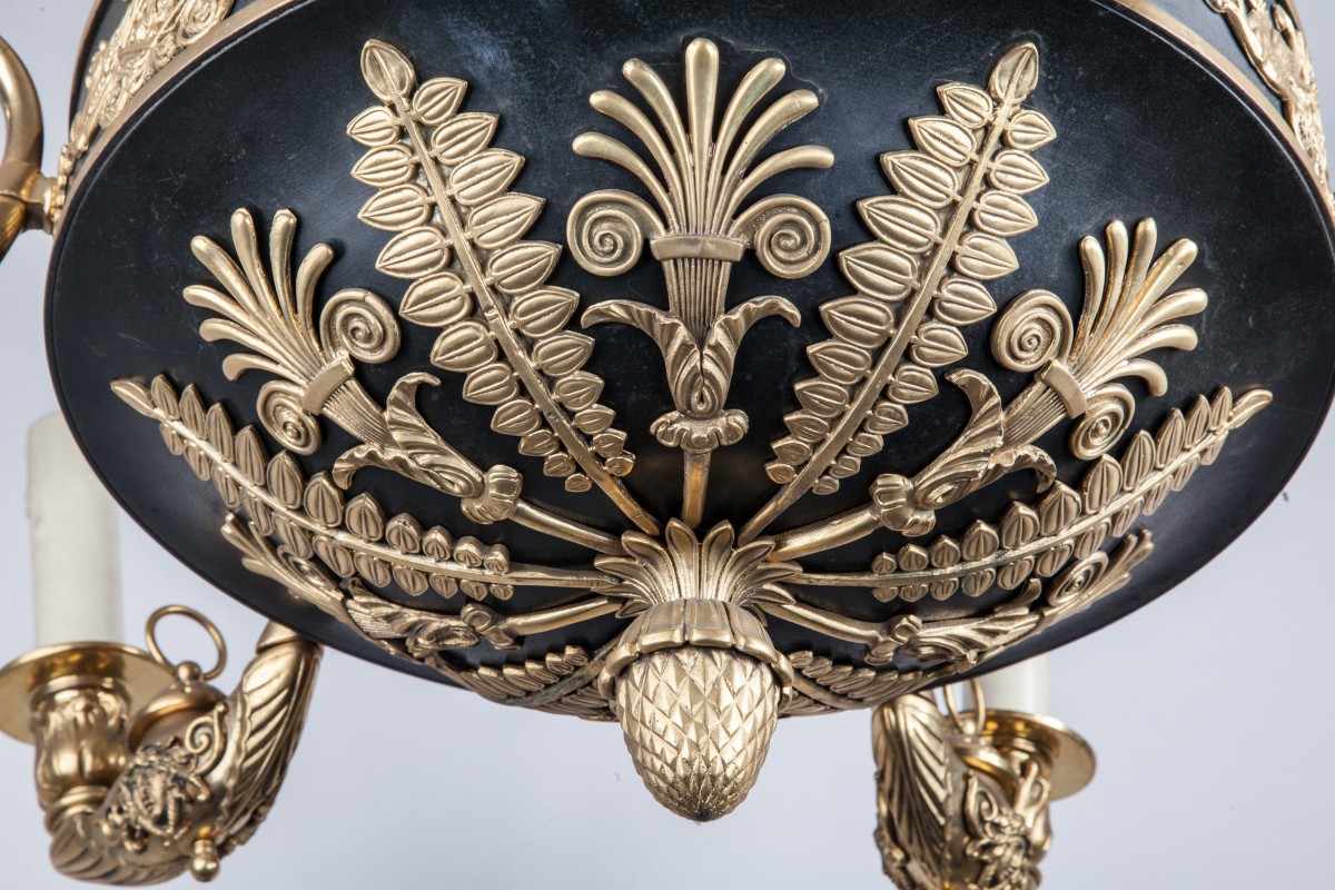 Petit LUSTRE en bronze doré et tôle patinée en forme de lampe antique à six bras de lumière en forme de lampe à huile. Décor de palmettes, feuillages, mascarons et griffons.