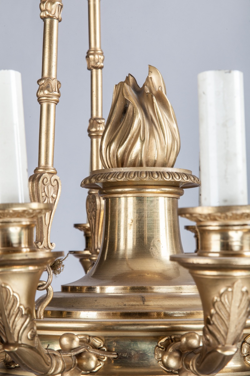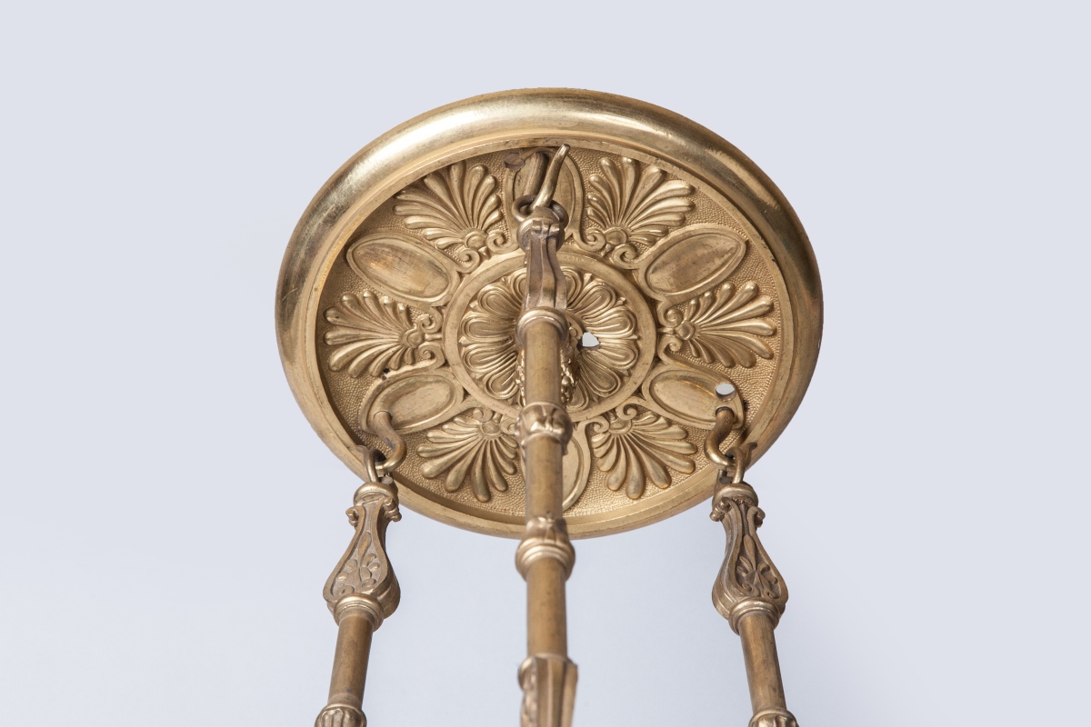 LUSTRE en bronze et tôle dorée en forme de lampe antique à douze bras de lumière ornés de palmettes et feuilles de lotus. Trois chaînes de suspension en bronze à bagues.