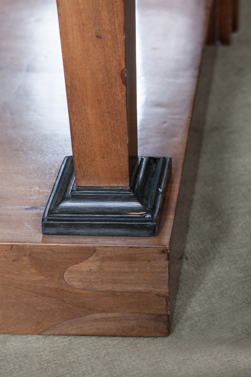 CONSOLE d'APPLIQUE rectangulaire en acajou et placage d'acajou, ouvrant à un tiroir. Montants antérieurs en gaine, à bustes d'égyptiennes coiffées du klaft, en bois patiné sur une base socle. Montants arrières en pilastre et fond de glace. Dessus de marbre noir de Belgique.