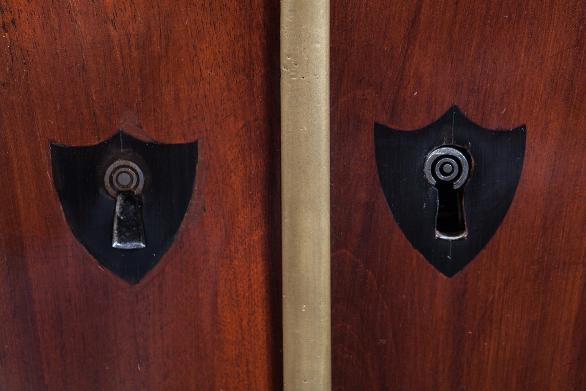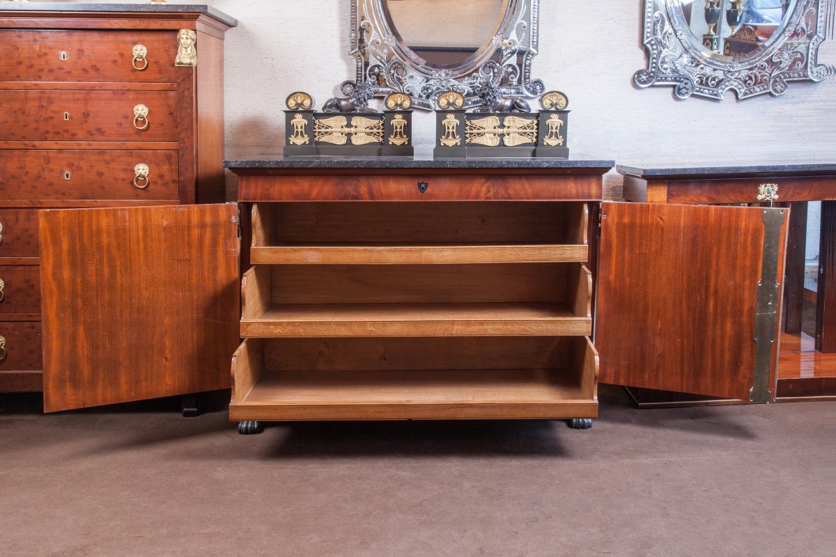 COMMODE à portes en placage d'acajou flammé ouvrant à un tiroir en surplomb et deux vantaux découvrant trois tiroirs à l'anglaise. Montants à cariatides en gaine à têtes de femme antique en bronze patiné. Pieds en bois patiné à griffes de lion. Dessus de marbre noir de Belgique. Entrées de serrure marquetées d'un écusson en ébène. Serrures à double canon.