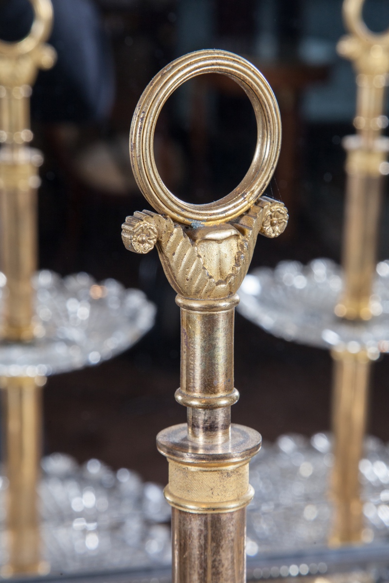 PAIRE de PRÉSENTOIRS en bronze doré à trois coupes (manque une) en cristal taillé à pointes de diamant. Pieds ornés de feuilles de lotus et rais de cur. Prises en anneau.