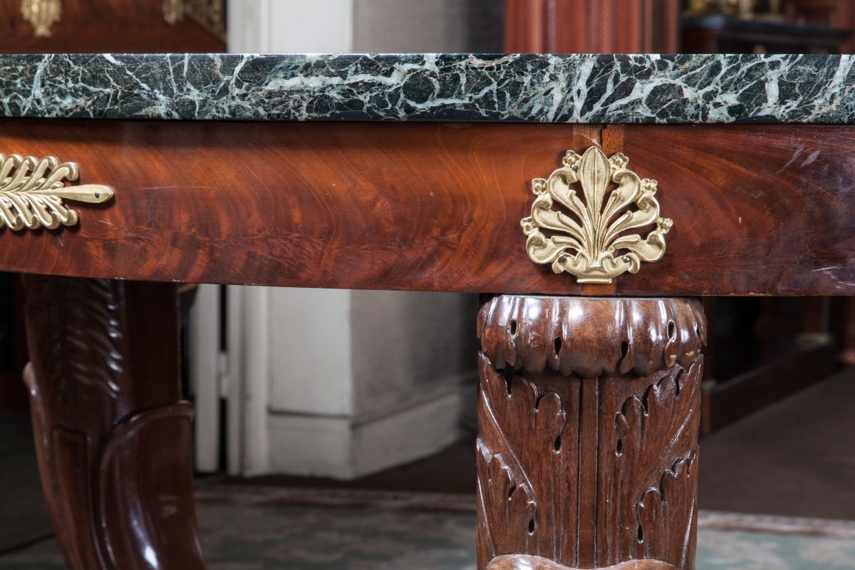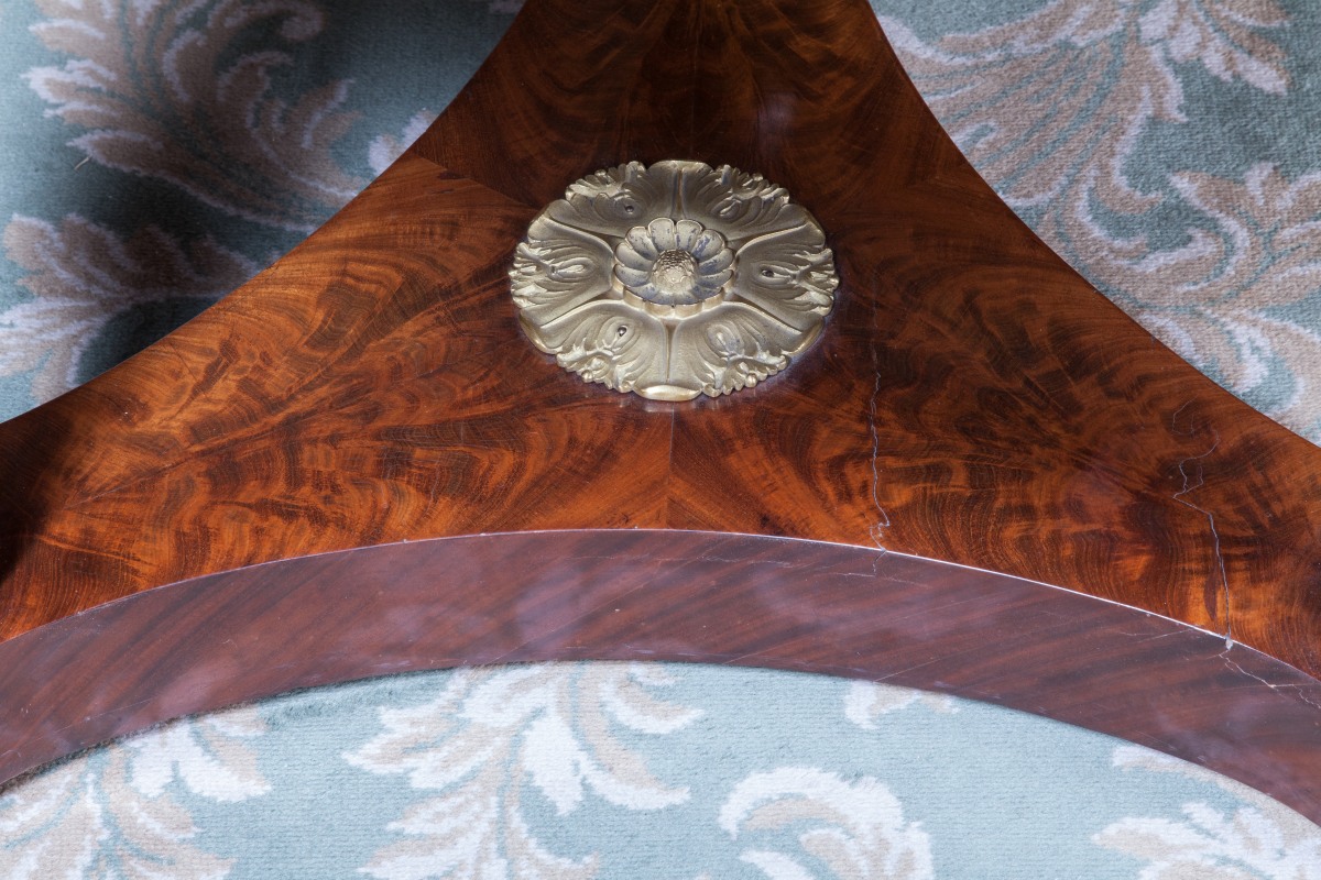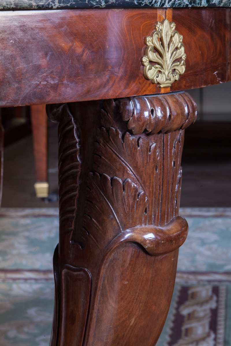 GUÉRIDON en acajou et placage d'acajou flammé. Trois montants en jarrets de lion feuillagés sur une base socle échancrée. Ornementation de bronzes dorés : fleurons et palmettes. Dessus de marbre vert de mer.