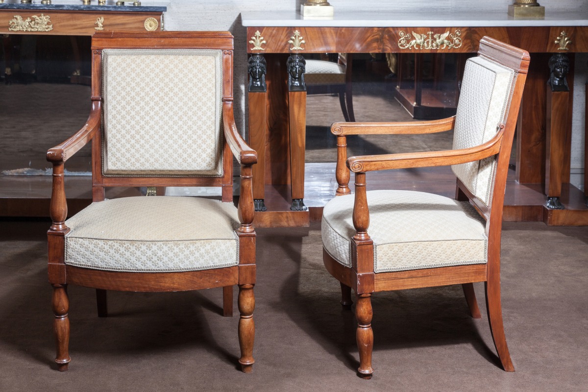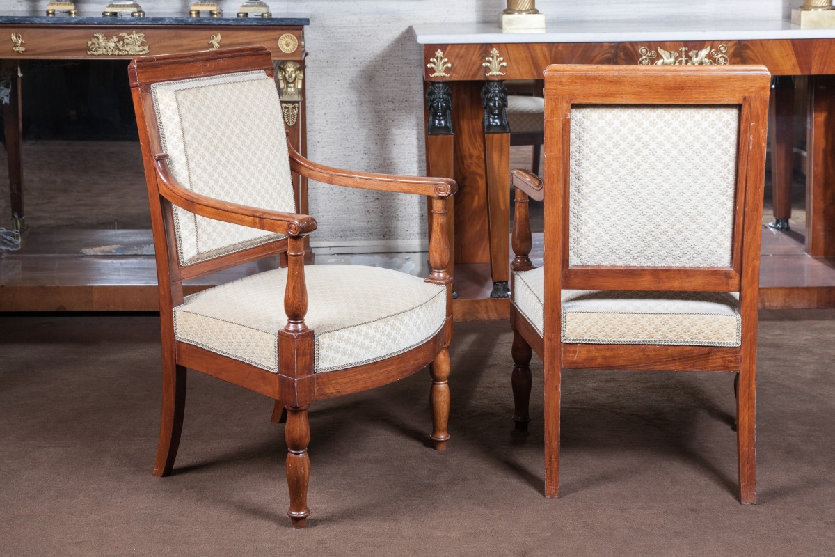 PAIRE de FAUTEUILS à dossier plat en acajou et placage d'acajou. Supports d'accotoirs en balustre. Pieds antérieurs réticulés, pieds arrières en sabre.