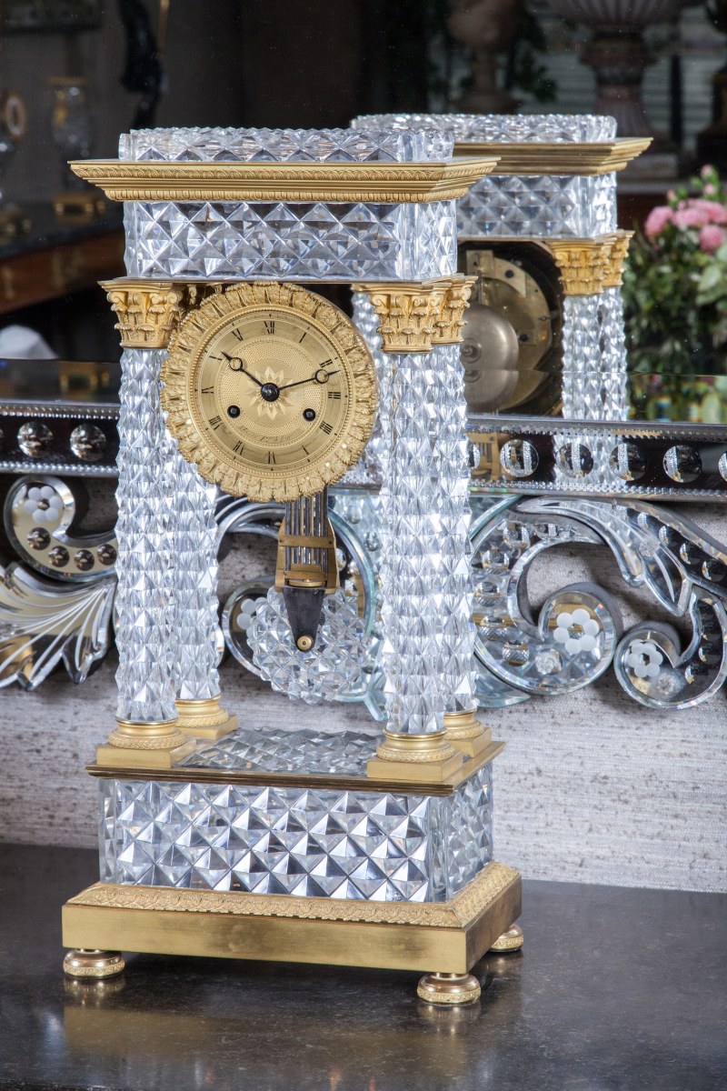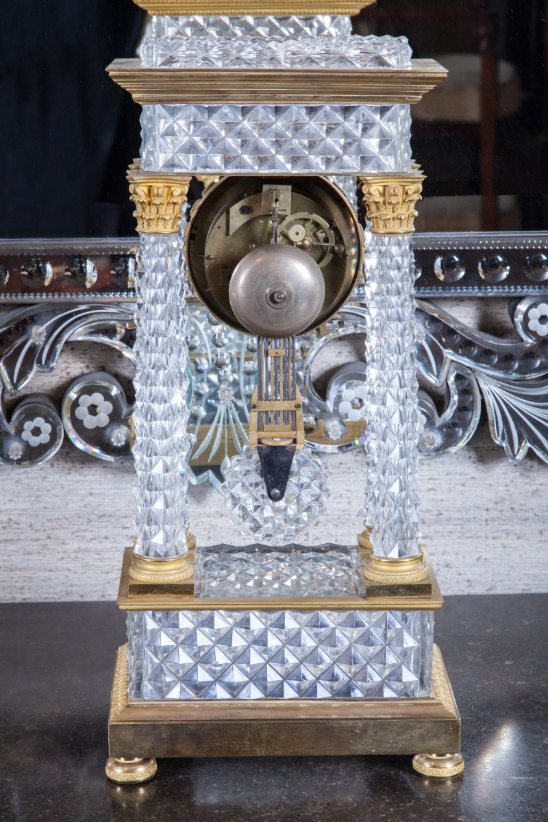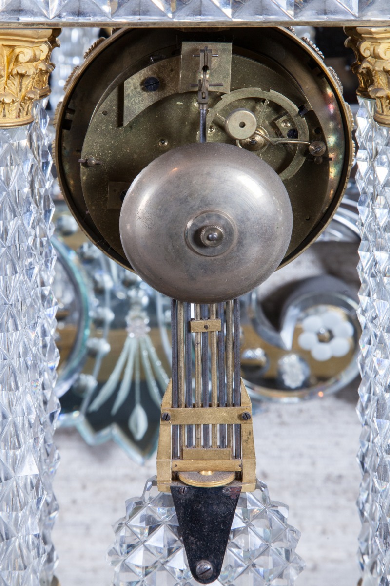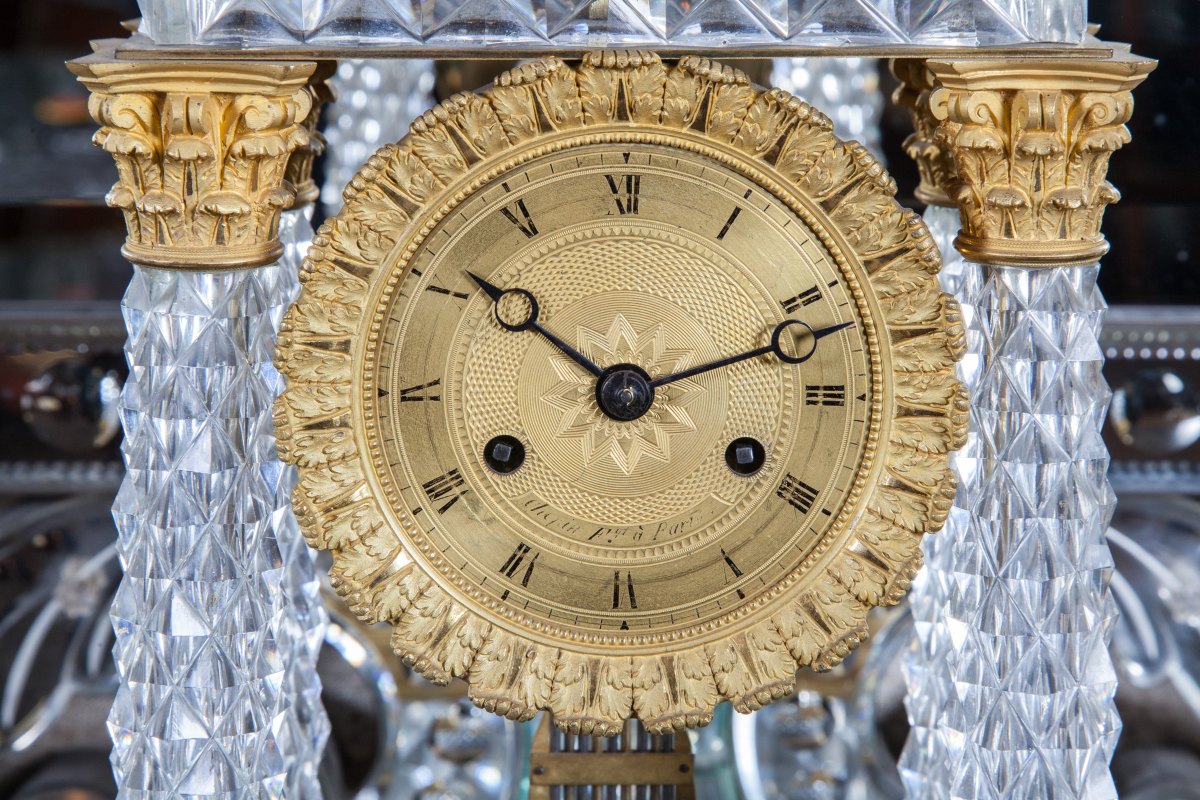 PENDULE PORTIQUE à quatre colonnes en cristal taillé à pointes de diamant. Monture en bronze doré : chapiteaux, astragale et base à pieds galettes. Cadran doré signé "Chopin à Paris". Balancier compensé.
