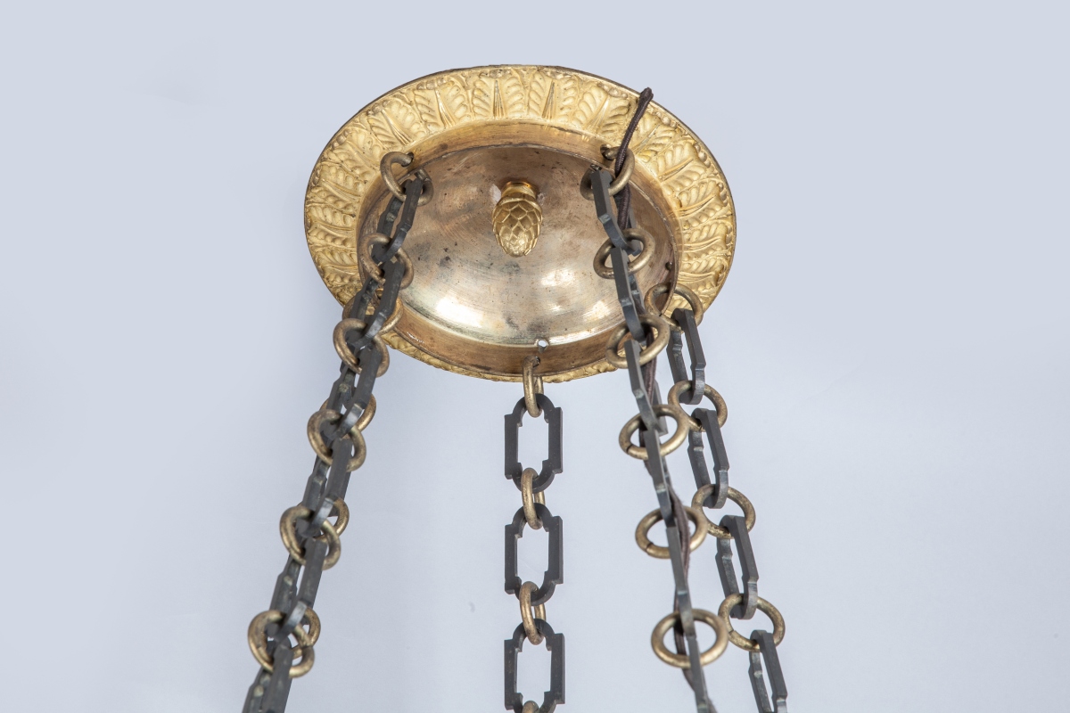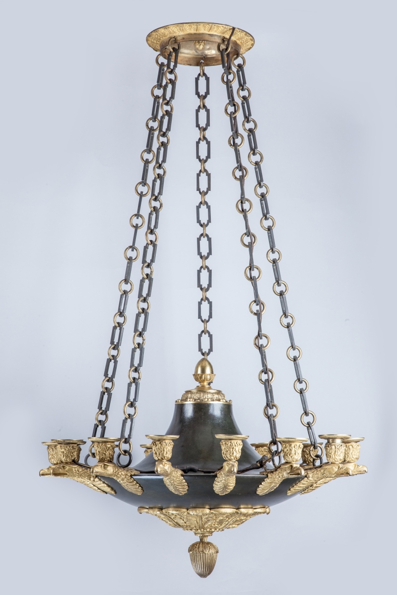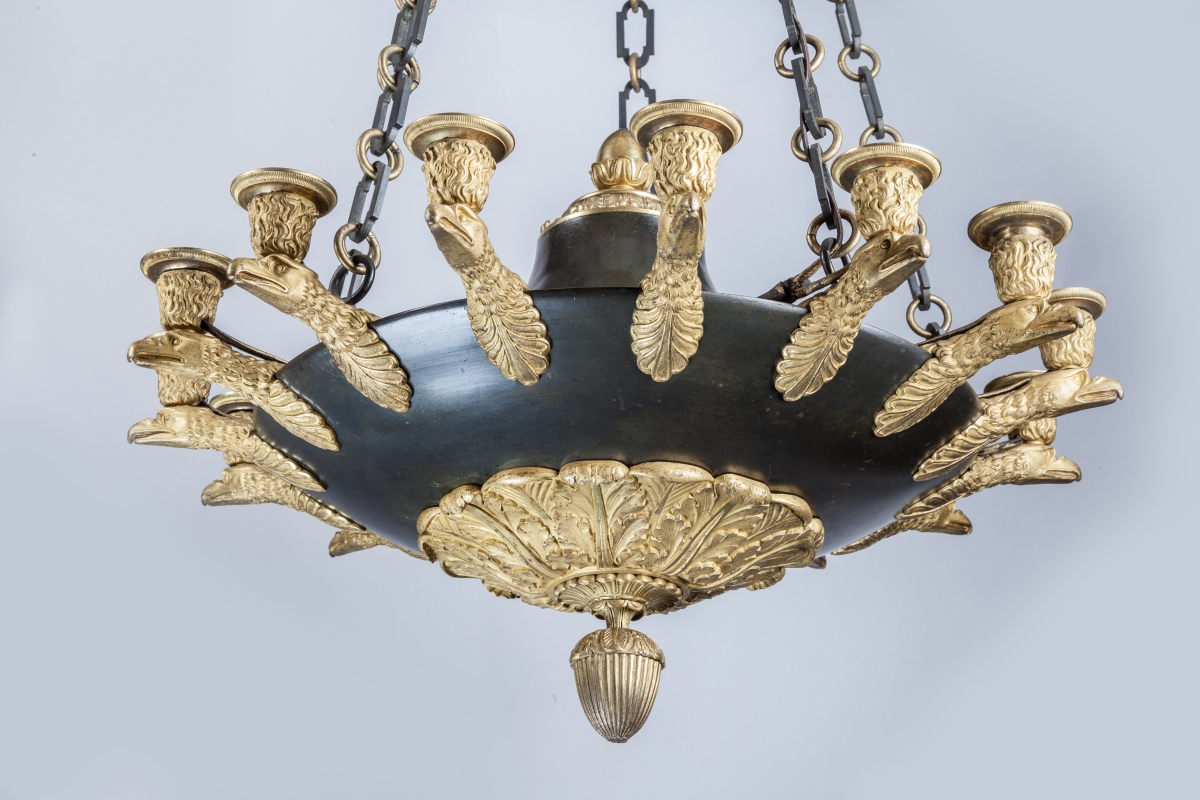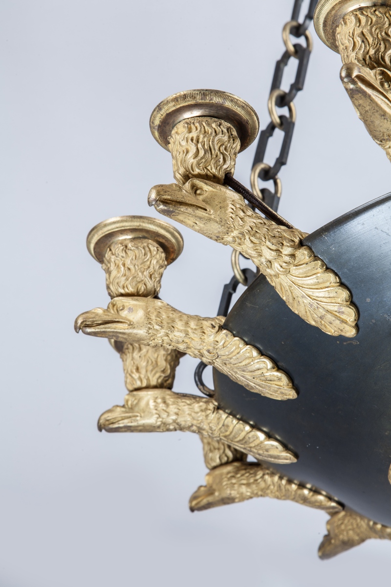 LUSTRE en forme de lampe antique à quinze lumières à têtes d'aigle soutenues par cinq chaînes.