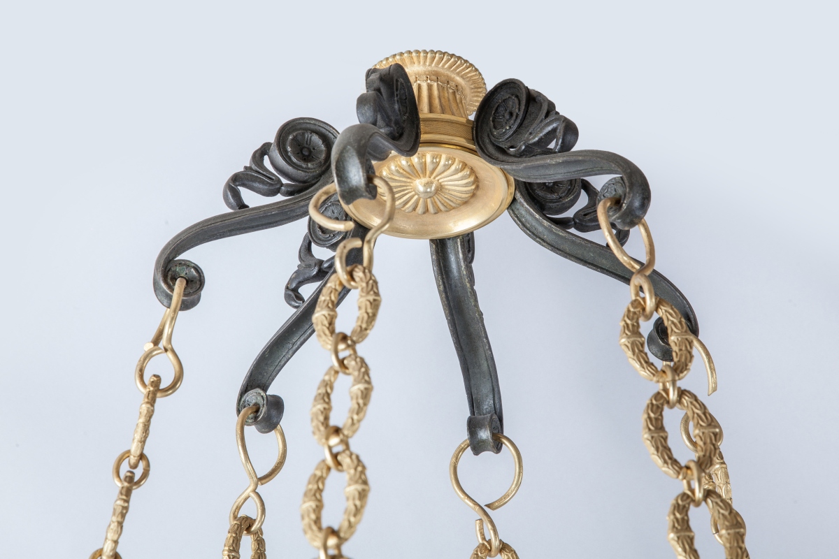 LUSTRE en forme de lampe antique à douze bras de lumière en bronze patiné et bronze doré à décor de fleurons, feuilles de laurier et feuilles lancéolées.