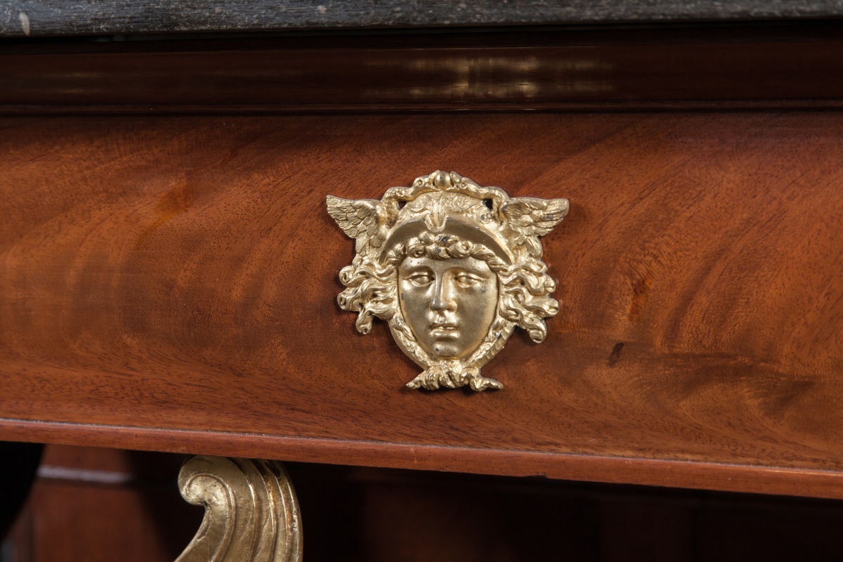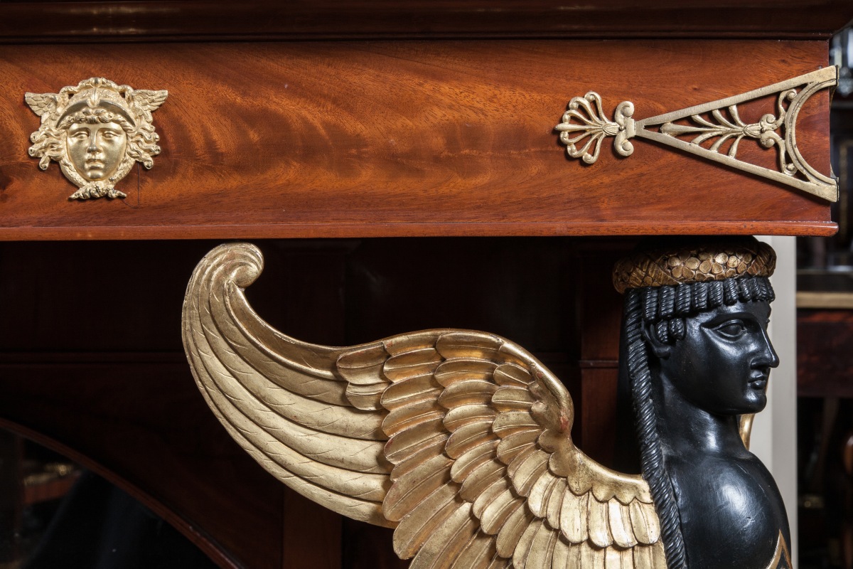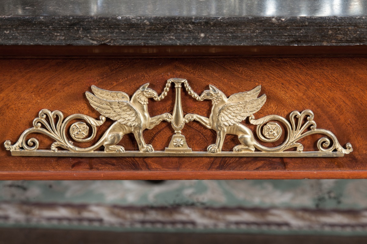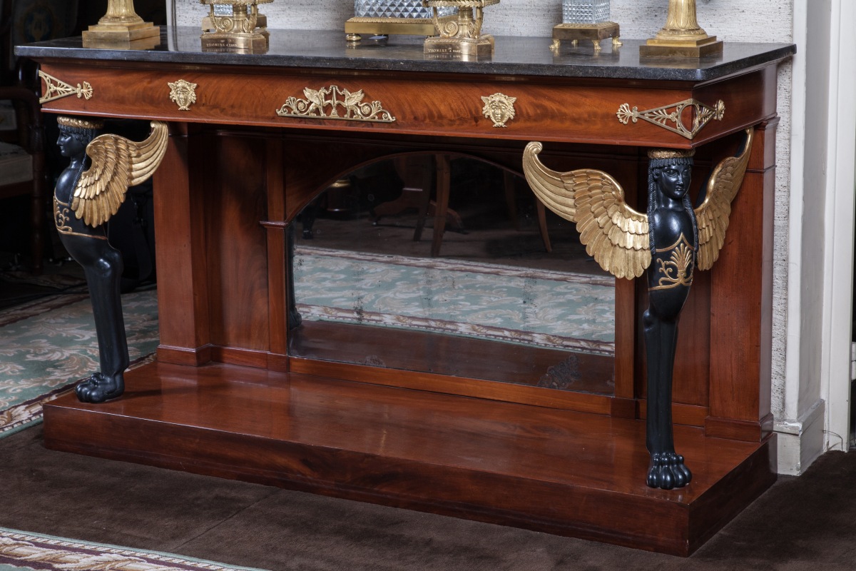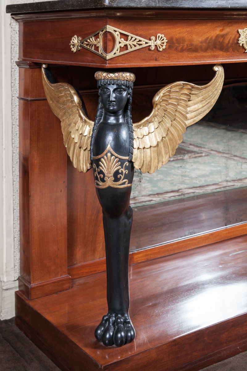 Large CONSOLE d'APPLIQUE rectangulaire en placage d'acajou. Montants antérieurs en chimères ailées et jarrets de lion en bois patiné et doré. Fond en placage d'acajou à pilastres encadrant un miroir cintré. Base socle. Dessus de marbre noir. Ornementation de bronzes dorés : griffons ailés, têtes de Mercure, palmettes et rinceaux ajourés.