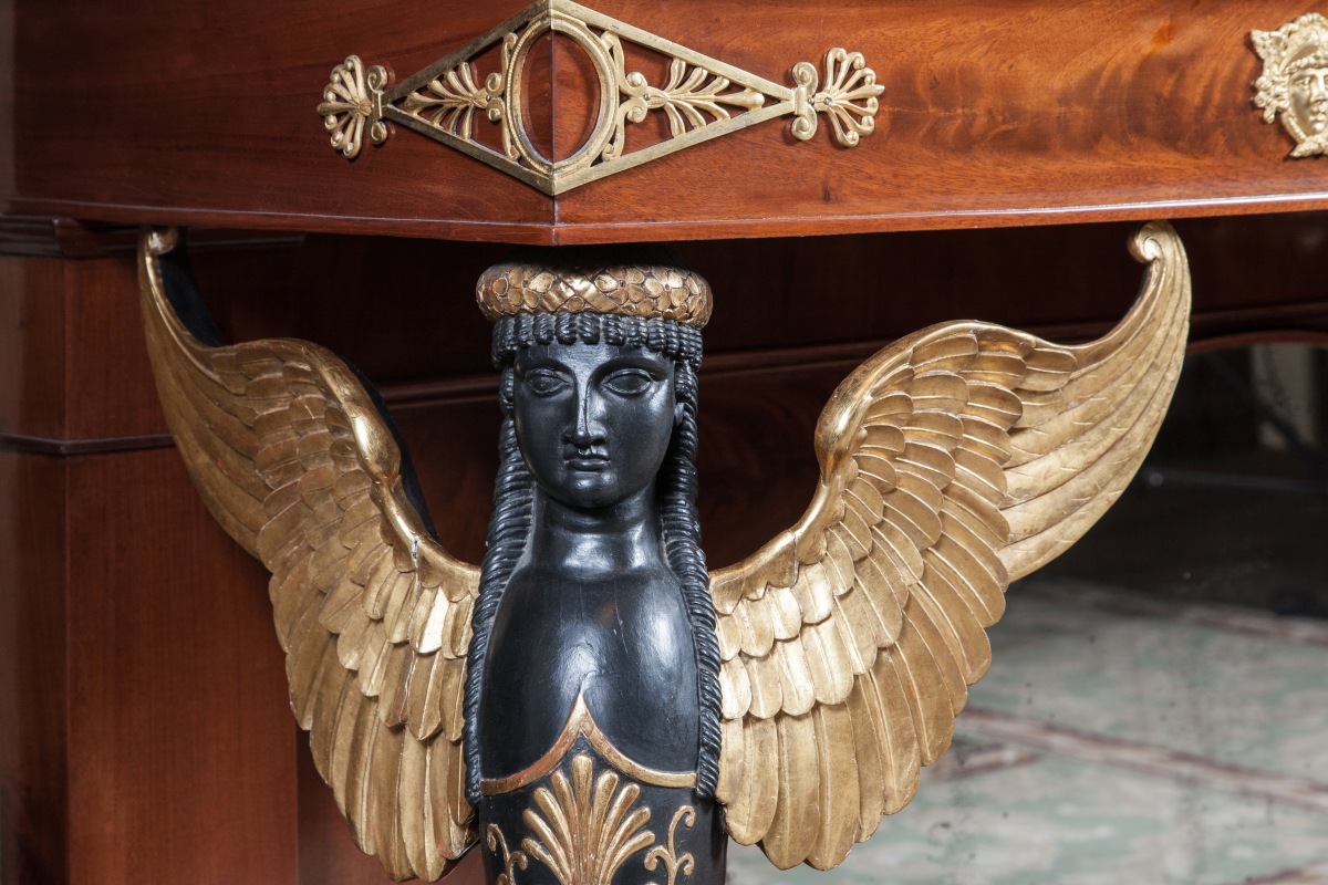 Le modèle de ces cariatides en chimères, ailes déployées, s'inspire d'une esquisse de Percier et Fontaine, conservée au Musée des Arts Décoratifs de Budapest (n° 24-283).