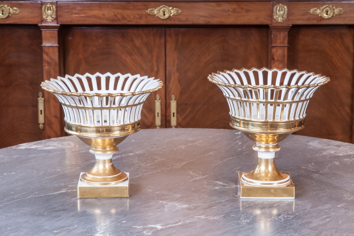 PAIRE de COUPES rondes ajourées à piédouche en porcelaine de Paris à décor doré.