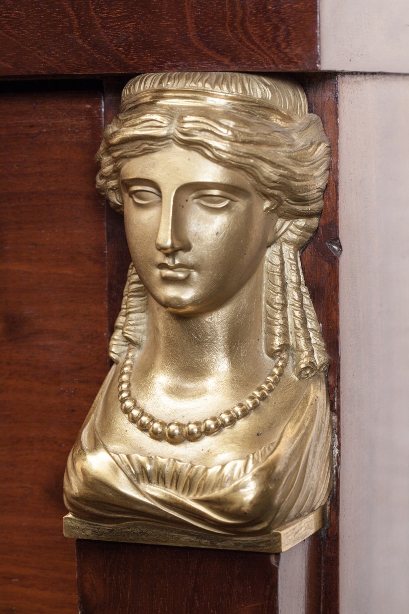CHIFFONNIER en placage d'acajou moucheté ouvrant à six tiroirs. Montants en gaine à têtes de femme antique en bronze doré. Poignées de tirage à mufles de lion et anneau mobile en bronze doré. Serrures à double canon. Dessus de marbre noir de Belgique.