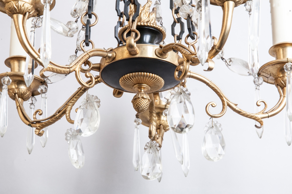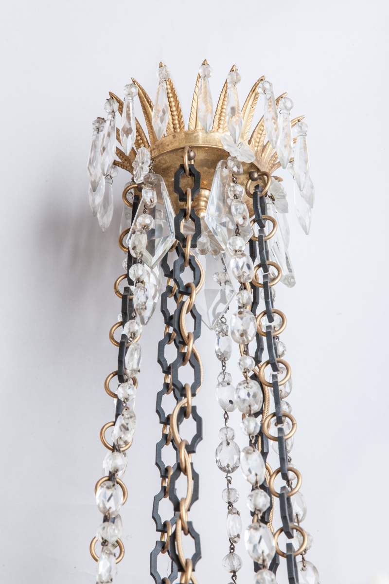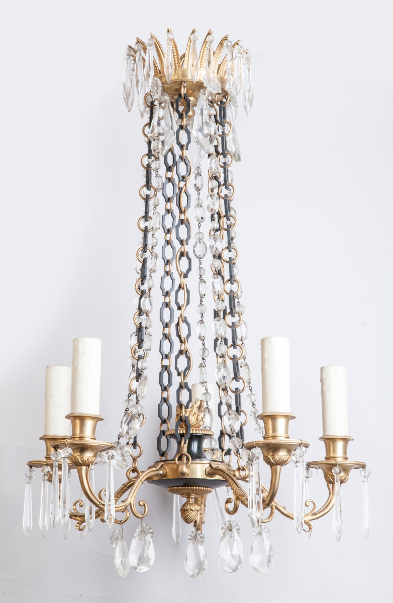 Petit LUSTRE à cinq lumières en bronze doré et bronze patiné orné de pendeloques et pampilles de verre et cristal, autour d'une lampe antique.
