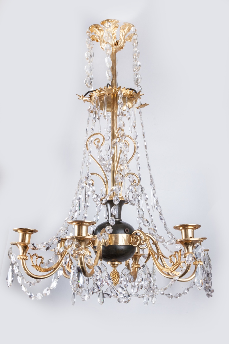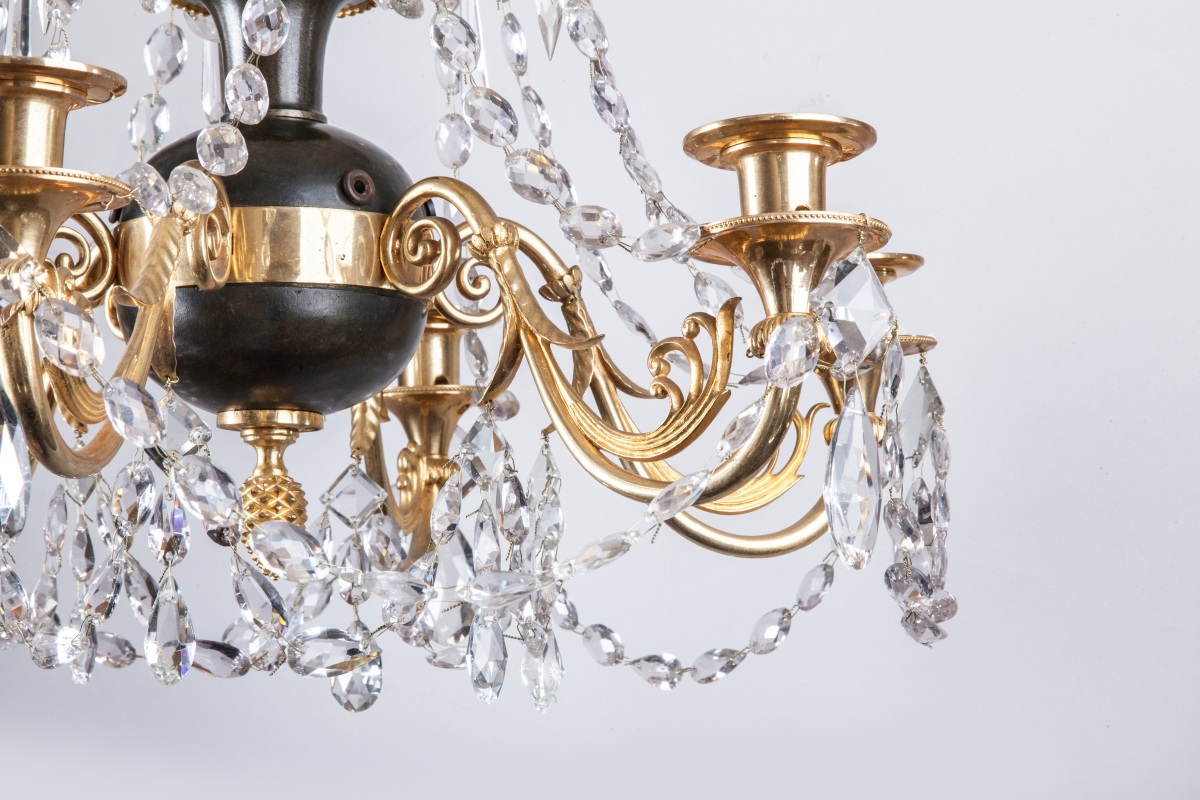 Petit LUSTRE en bronze doré et bronze patiné à six bras de lumière à volutes et palmettes autour d'un vase sphérique. Ornementation d'olives et pendeloques en cristal taillé.